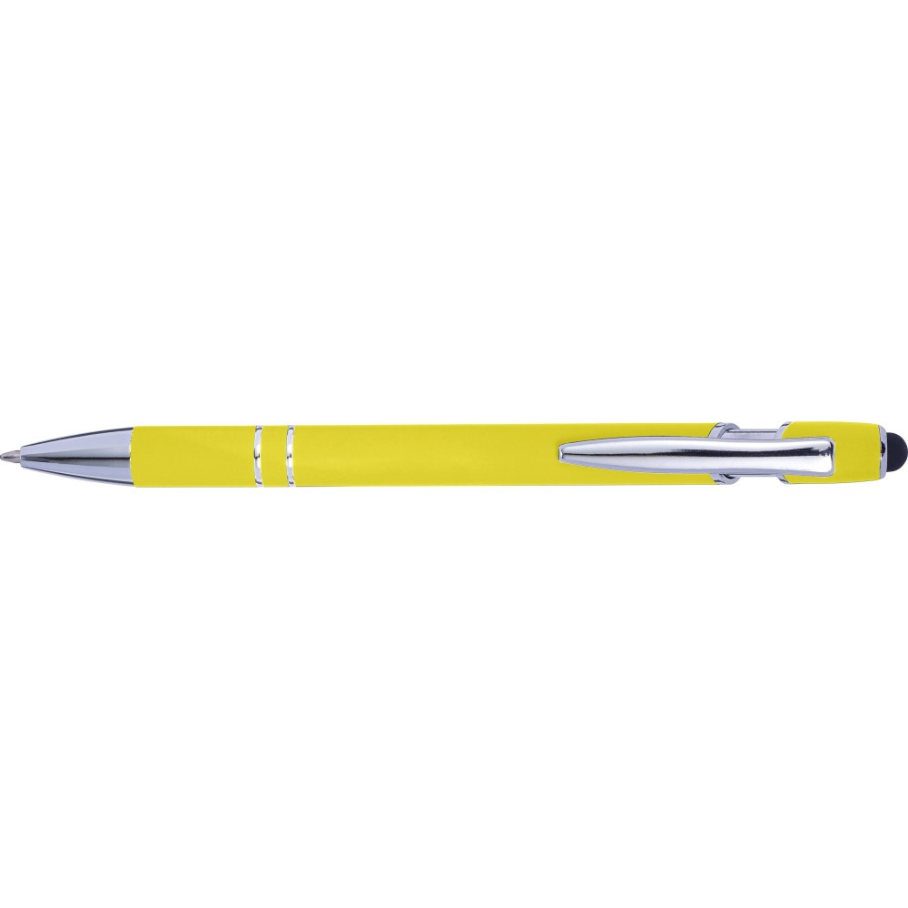Golyóstoll kék tollbetéttel, gumis felülettel és érintővel kapacitív képernyőkhöz. Kék tollbetéttel. A hegy és a klipsz ezüst színű műanyag. ABS, alumínium. Emblémázás: Gravírozás, UV nyomtatás