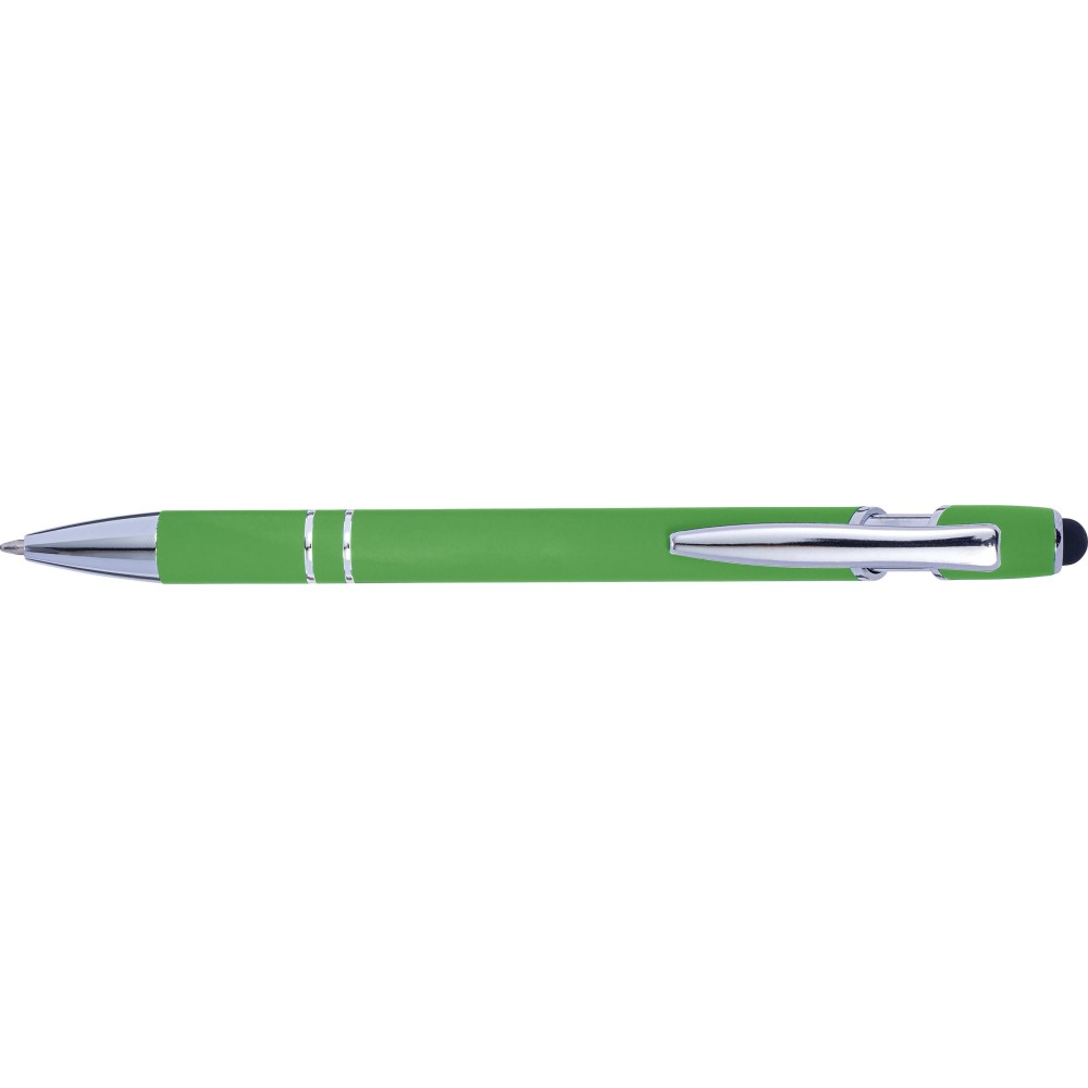 Golyóstoll kék tollbetéttel, gumis felülettel és érintővel kapacitív képernyőkhöz. Kék tollbetéttel. A hegy és a klipsz ezüst színű műanyag. ABS, alumínium. Emblémázás: Gravírozás, UV nyomtatás