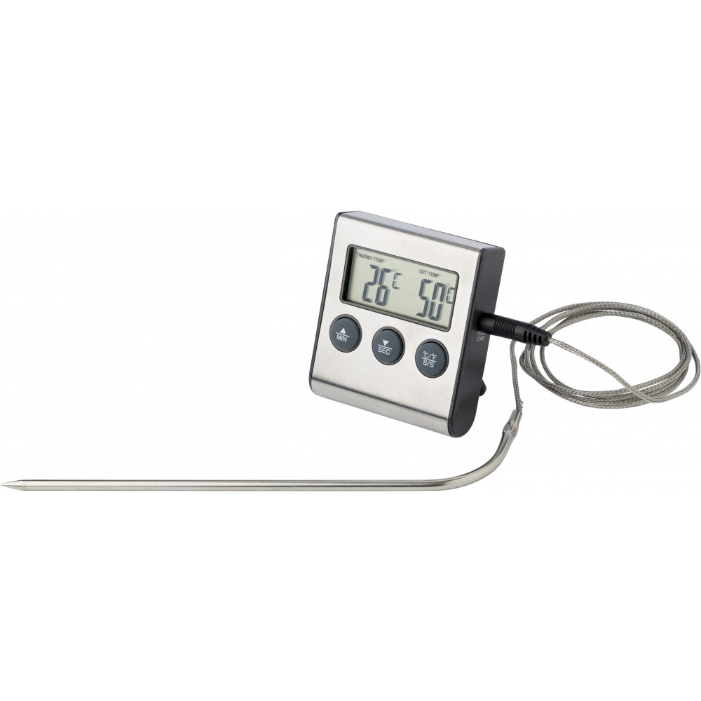 Időmérő és időzítő funkcióval ellátott húshőmérő mágnessel, állvánnyal, ABS műanyagból. Az elemet tartalmazza. Emblémázás: Gravírozás, Tamponnyomás