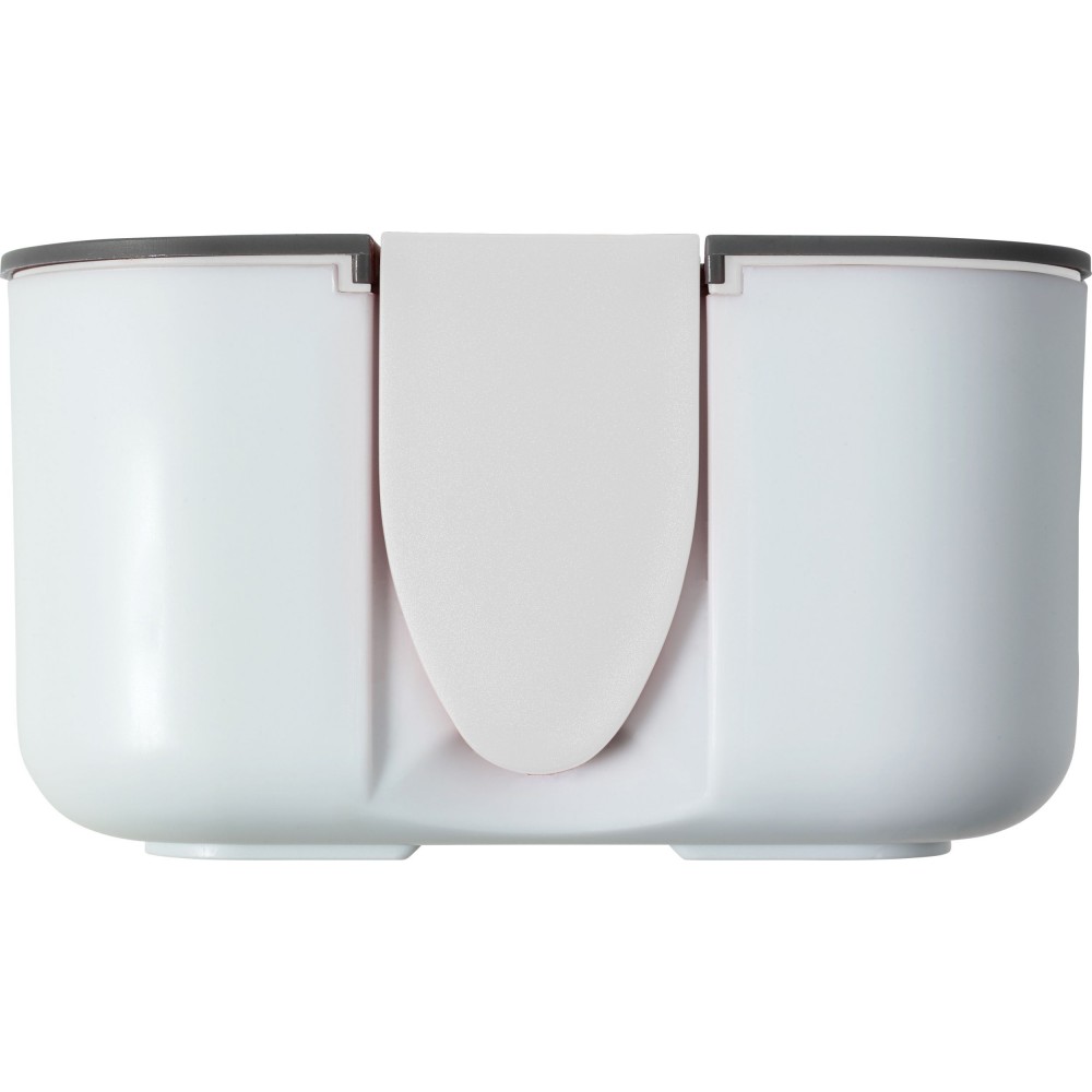 Ételdoboz egy belső elválasztóval. A fedélen lévő zárószerkezet telefontartóként is használható. Fedél nélkül mikrózható, csak a doboz. Űrtartalom: 850 ml. PP BPA-mentes műanyag. Emblémázás: Tamponnyomás, UV nyomtatás
