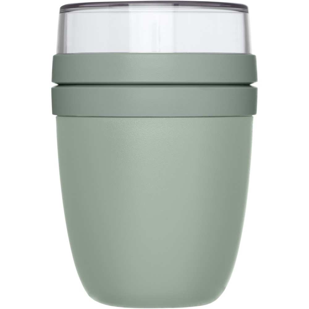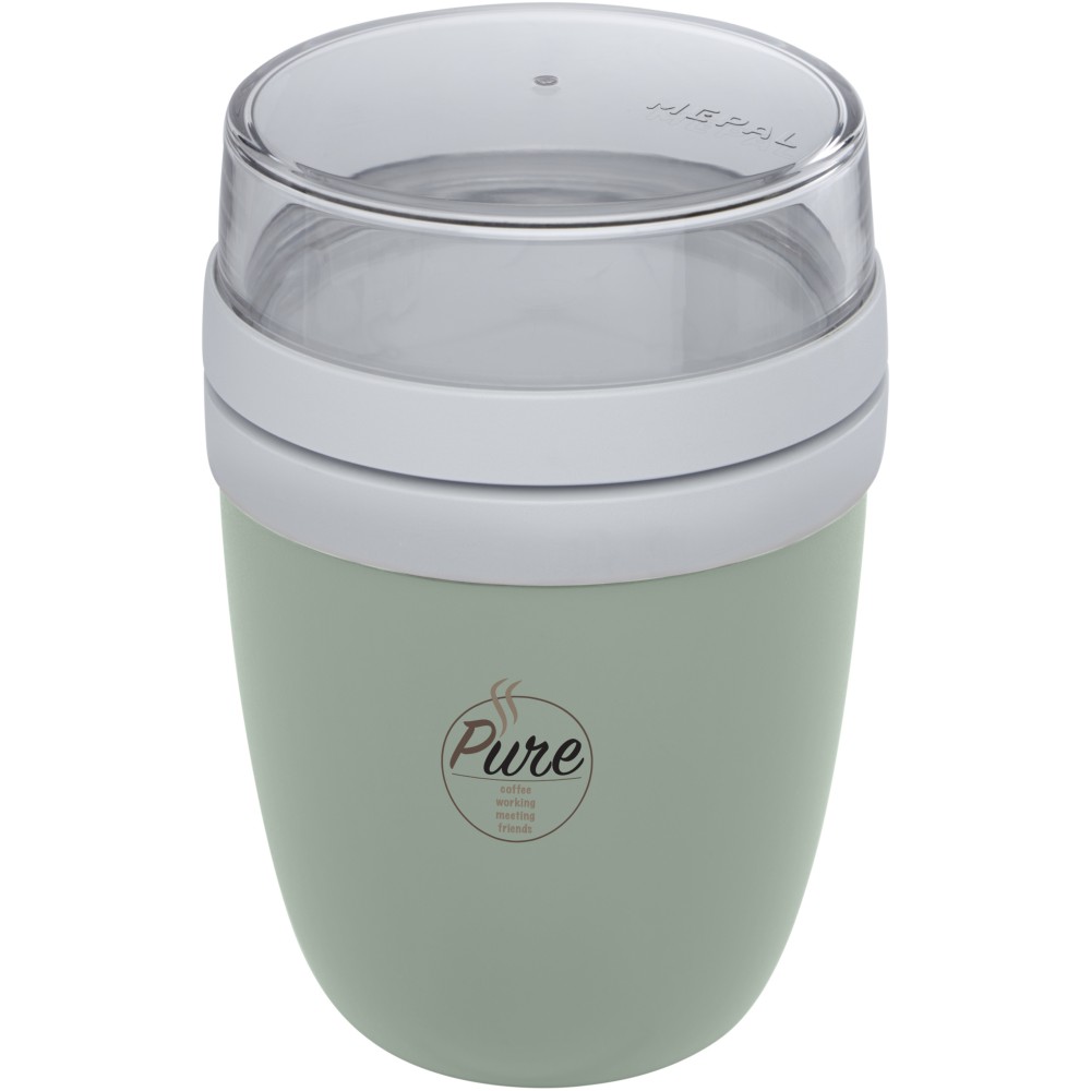 Ételtartó edény két rekesszel. Mindkét tartálynak külön fedele van. A felső, átlátszó rész űrtartalma 200 ml. Az alsó edény 500 ml-es. Fagyasztóba, mikrohullámú sütőbe (fedél nélkül), és mosogatógépbe tehető. A felső, átlátszó rész nem tehető mikrohullámú sütőbe. Szivárgásmentes. BPA mentes. PP műanyag, PCTG műanyag. Emblémázás: Tamponnyomás