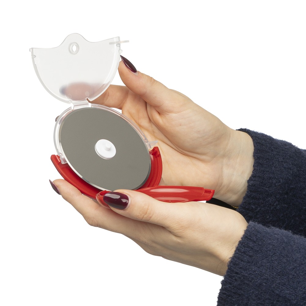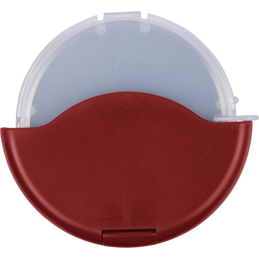 ABS és PP anyagból készült pizzavágó 430-as rozsdamentes acél pengével, kivehető védőborítással, amely könnyen felpattintható a tisztítás és a penge elérése érdekében. Újrahasznosított polietilén tasakba csomagolva. Emblémázás: Tamponnyomás