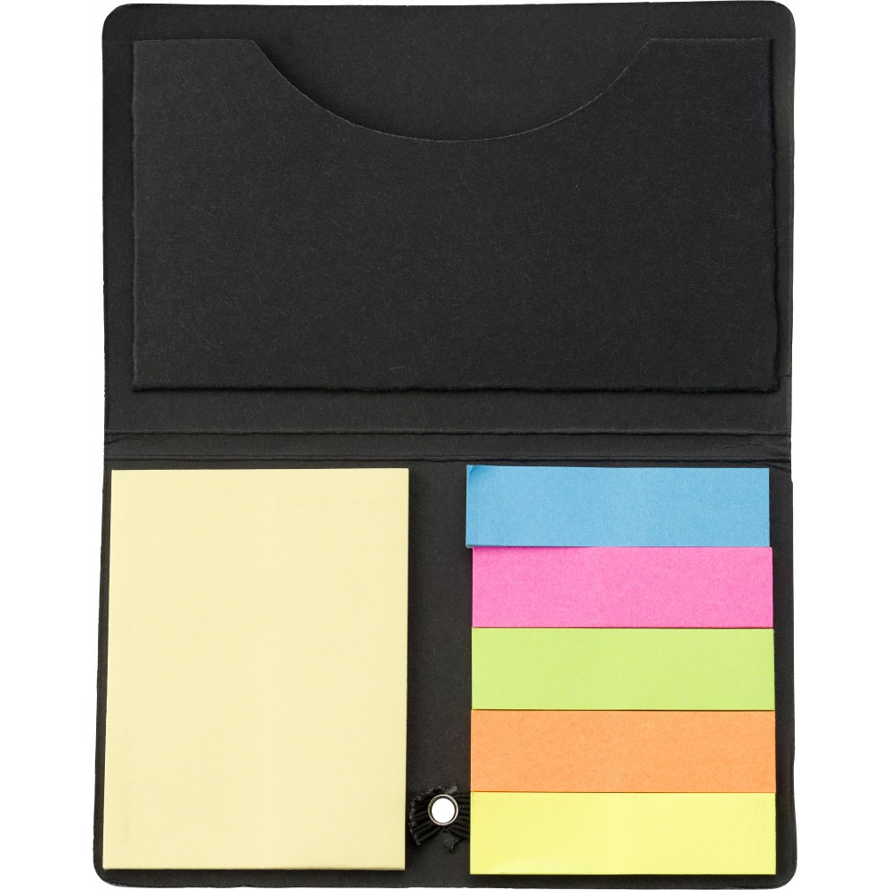 Jegyzettömbkészlet. Karton tartó összefogó pánttal, mely 150 öntapadó jegyzetlapot, valamint névjegyek tárolására alkalmas zsebet tartalmaz. Emblémázás: Szitanyomás, Tamponnyomás