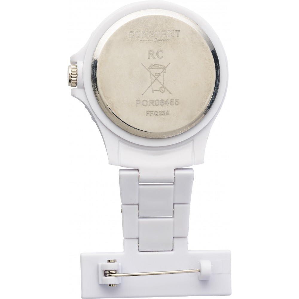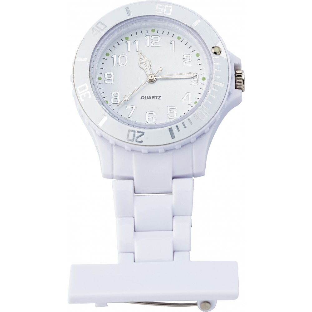 Orvosok, ápolók számára készült óra, mely a köpeny mellzsebére tűzve viselője számára egyetlen fejbiccentéssel lehetővé teszi, hogy megtudja a pontos időt. Emblémázás: Tamponnyomás