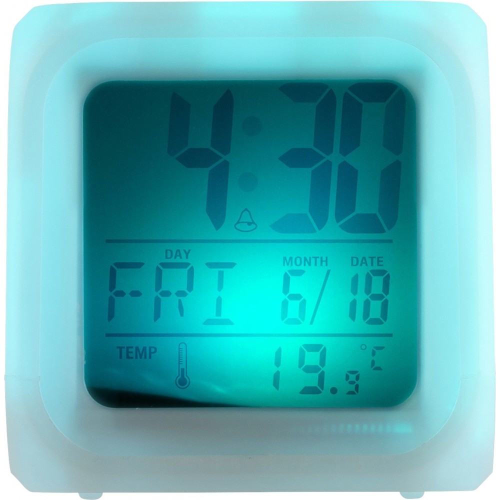 Kocka alakú ébresztőóra változó színű fénnyel. Funkciói: óra, naptár, hőmérő. Az elemet tartalmazza. HIPS műanyag. Emblémázás: Tamponnyomás, UV nyomtatás