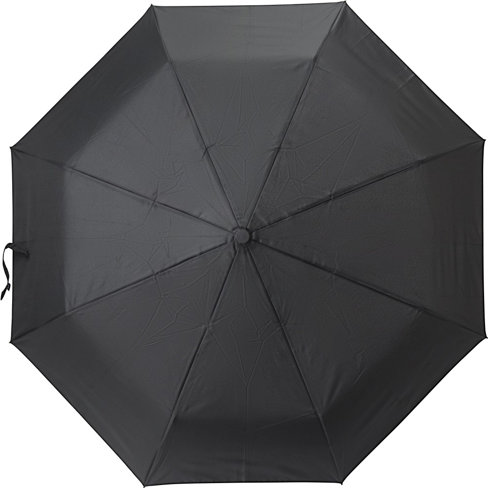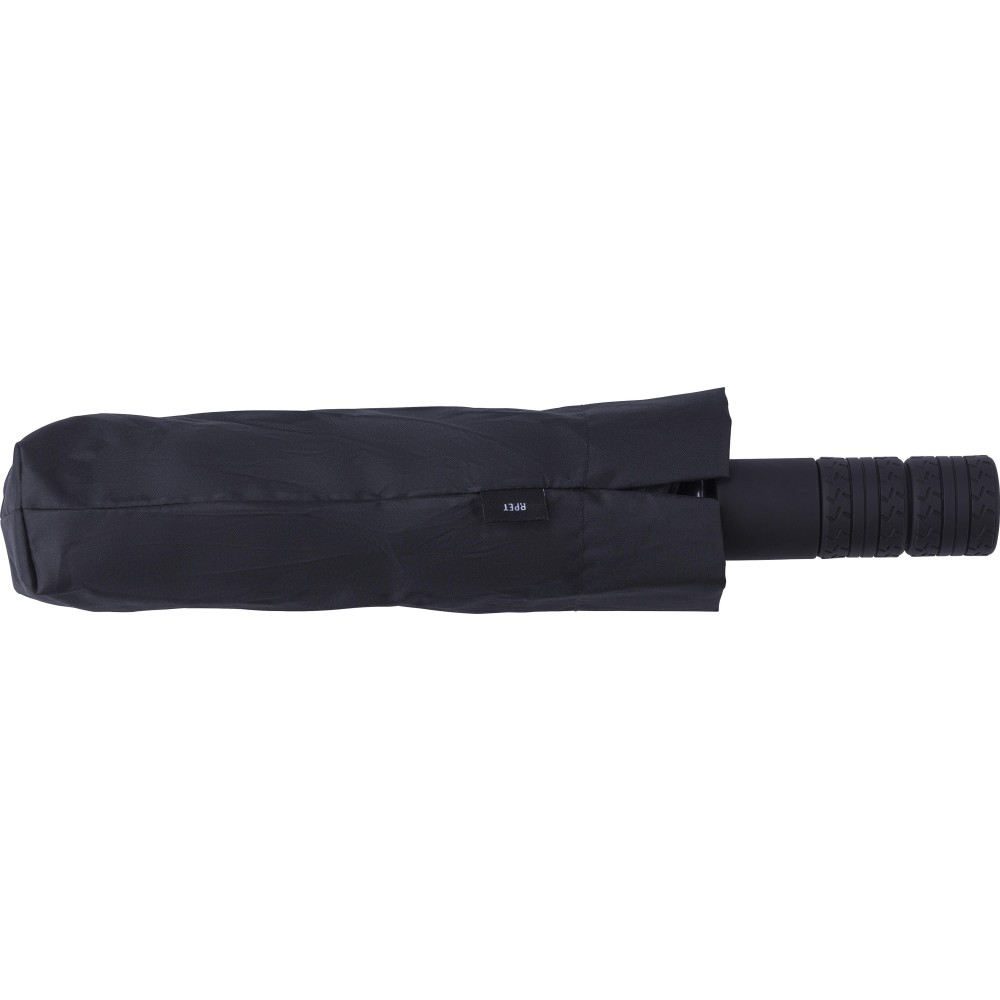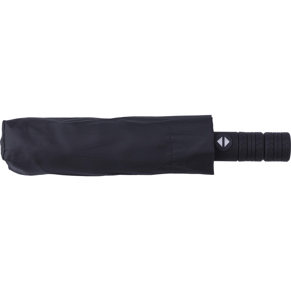 Automata nyitású és zárású, összecsukható esernyő 8 panellel, tokkal. Nyele gumis mintázatú, az autók abroncsára emlékeztet. Vászna RPET pongee anyag. Mérete: 21". Emblémázás: Szitanyomás