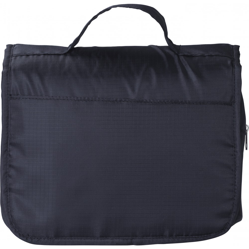 Piperetáska akasztóval. Kinyitva felül átlátszó zseb. Belül egy nagy cipzáras hálós zseb és egy kis zárt cipzáras zseb található. Hátoldalán egy rekesz. Rövid fogantyú. Ripstop 210D. Emblémázás: Szitanyomás