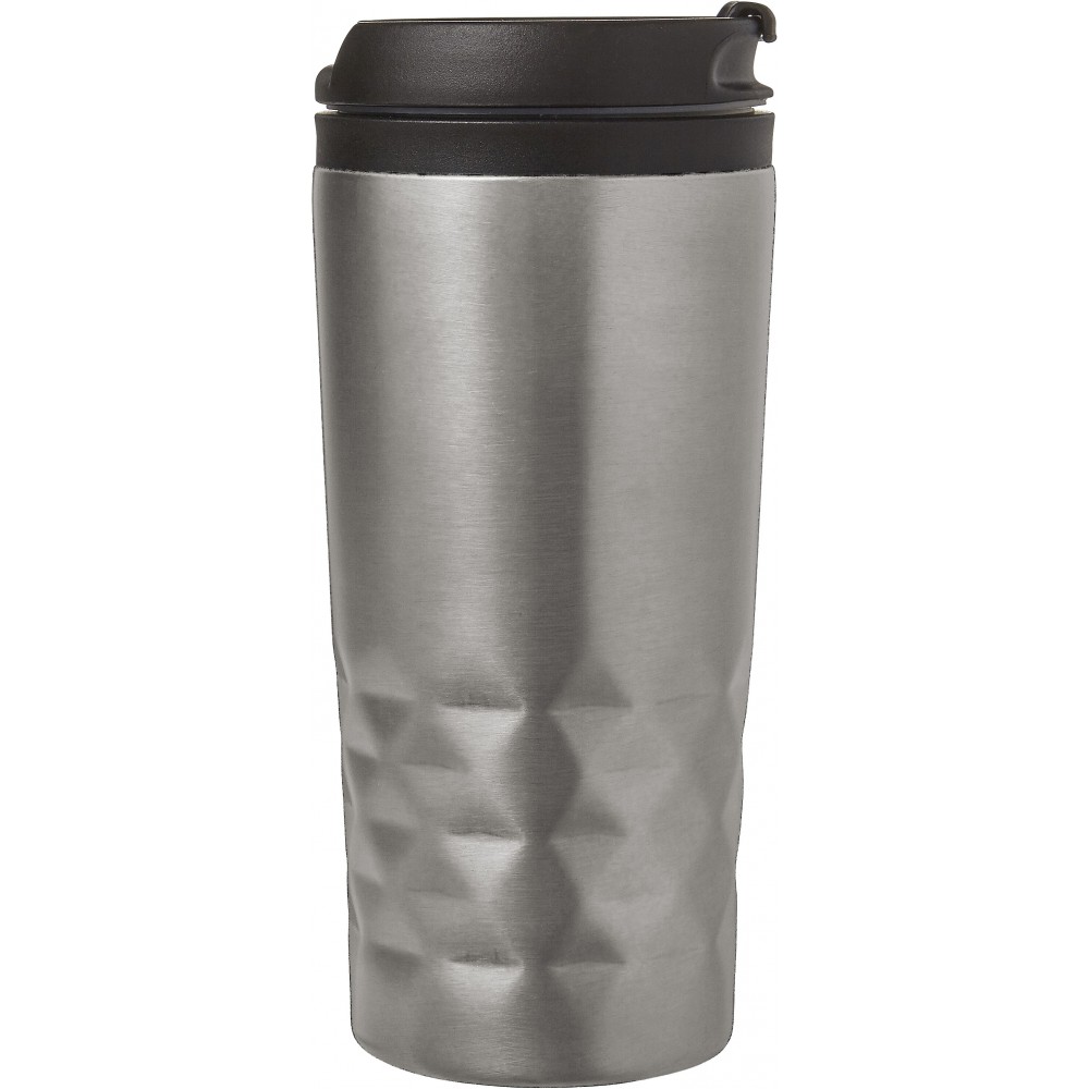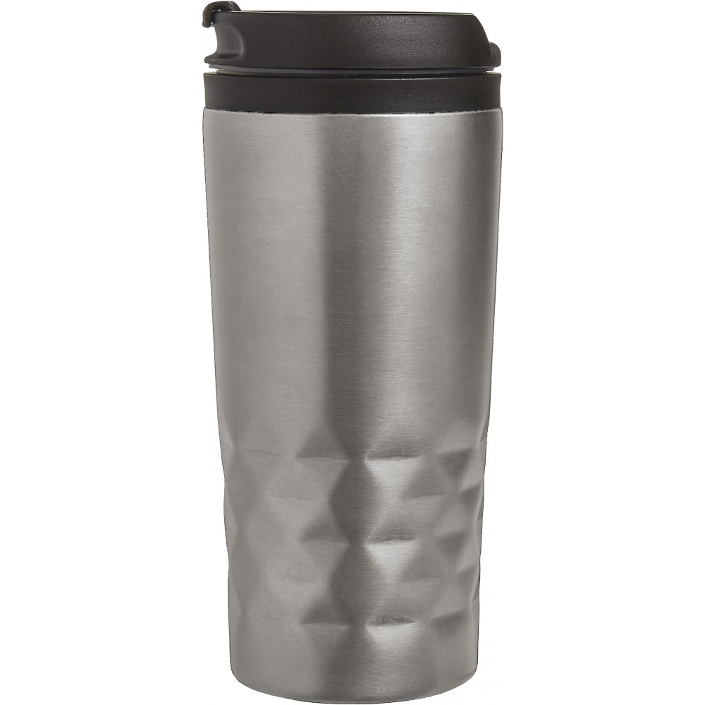 Duplafalú fedeles pohár. 300 ml. Rozsdamentes acél és BPA-mentes műanyag. Nem szivárgásmentes és nem mosogatógépálló termék. Emblémázás: Gravírozás, Körszita, Tamponnyomás