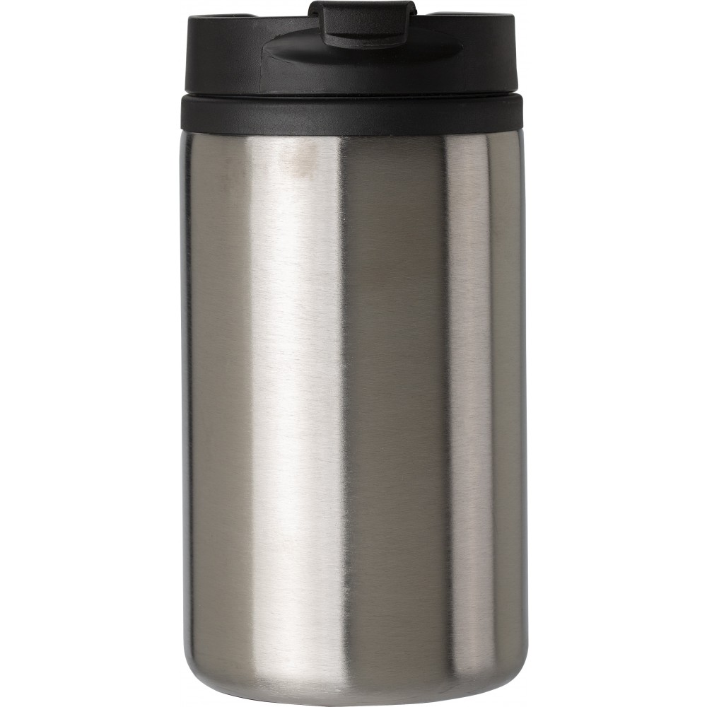 Duplafalú termoszpohár. A külső fal rozsdamentes acél, a belső fal műanyag. A csavaros fedél szivárgásmentes. A pohár alja csúszásgátlóval van ellátva. 300 ml. BPA-mentes műanyag. Nem mosogatógépálló termék. Emblémázás: Gravírozás, Körszita, Tamponnyomás