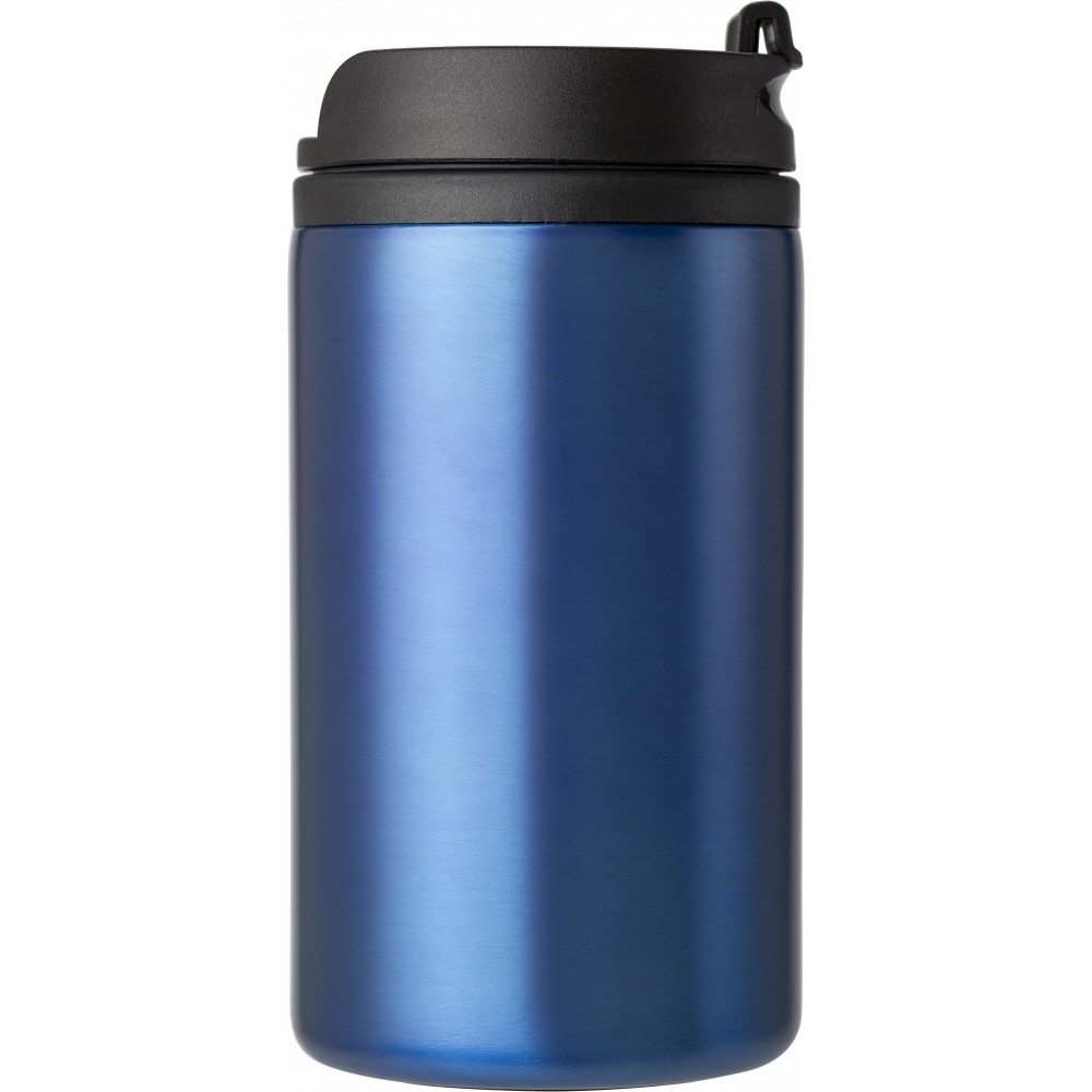 Duplafalú termoszpohár. A külső fal rozsdamentes acél, a belső fal műanyag. A csavaros fedél szivárgásmentes. A pohár alja csúszásgátlóval van ellátva. 300 ml. BPA-mentes műanyag. Nem mosogatógépálló termék. Emblémázás: Gravírozás, Körszita, Tamponnyomás