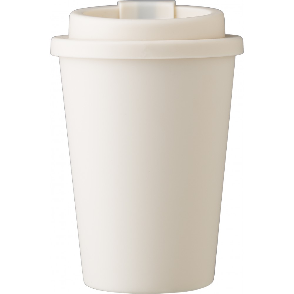 Kávéspohár csavaros fedéllel és felpattintható ivórésszel. Jó hőtartó, hideg és meleg italokhoz is használható. Űrtartalom: 350 ml. PP műanyag. Emblémázás: Körszita, Tamponnyomás