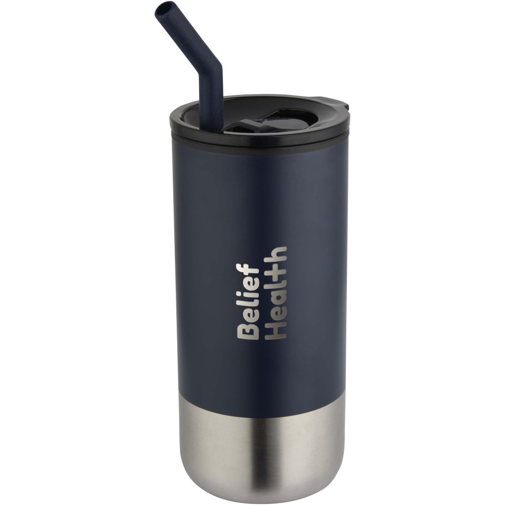 Ez a 480 ml űrtartalmú termoszpohár duplafalú, hőszigetelt kialakítással rendelkezik és egy szilikon véggel ellátott, újrahasznosított rozsdamentes acél szívószál tartozik hozzá a kényelmes használat érdekében. A belső fal PP műanyagból, míg a külső rész RCS tanúsítvánnyal rendelkező, újrahasznosított rozsdamentes acélból készült. A PS és ABS műanyagból készült csúsztatható fedél, valamint a matt külső bevonat elegáns megjelenést kölcsönöz a terméknek. Emblémázás: Körszita
