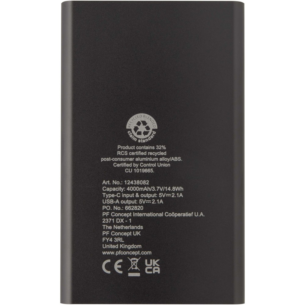Pep Type-C újrahasznosított alumínium powerbank, 4000 mAh, fekete