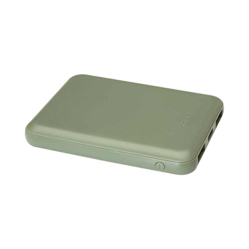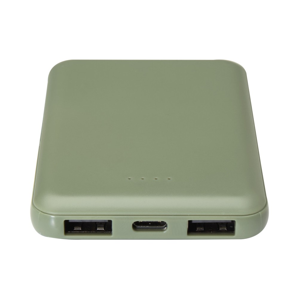 Karcsú és elegáns kialakítású powerbank, Type-C bemeneti/kimeneti porttal és 2 db USB-A porttal, amelyek lehetővé teszik három eszköz egyidejű töltését. A powerbank 5000 mAh kapacitású lítium-polimer akkumulátorral rendelkezik, amely max. 10W teljesítményt biztosít. A powerbank 23%-ban RCS tanúsítvánnyal rendelkező újrahasznosított műanyagból készült. TPE Type-C - USB-A töltőkábellel szállítjuk. Emblémázás: Tamponnyomás