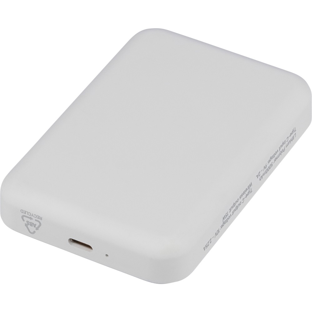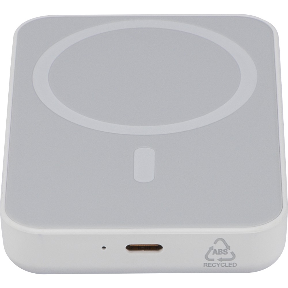 Újrahasznosított ABS anyagból készült vezeték nélküli töltős powerbank 5 000 mAh kapacitással és 15 W MagSafe kompatibilis vezeték nélküli töltéssel. Type-C in/out csatlakozással, beépített biztonsági védelmekkel és automatikus kikapcsolási funkcióval. Nem MagSafe készülékekhez fémgyűrűt tartalmaz. Az oldalán gravírozott recycled (újrahasznosított) alapanyagra utaló logó található. Selyempapírral bélelt barna dobozba csomagolva. Emblémázás: UV nyomtatás