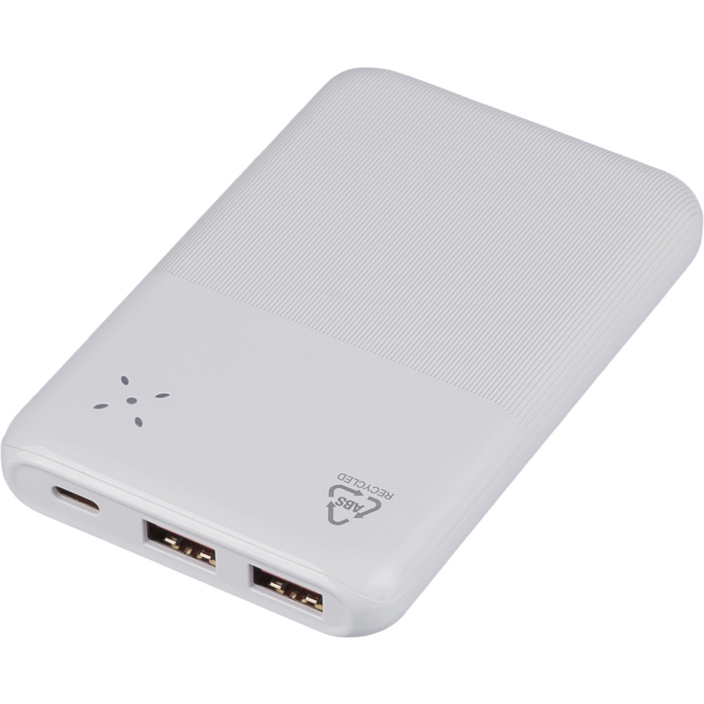 Újrahasznosított ABS anyagból készült powerbank 10 000 mAh kapacitással és 22,5 W gyors töltési teljesítménnyel. Type-C in/out és Type-A bemenettel, digitális kijelzővel, sima és texturált felülettel. Biztonsági védelmekkel ellátva. A hátoldalon gravírozott recycled (újrahasznosított) alapanyagra utaló logó található. Selyempapírral bélelt barna dobozba csomagolva. Emblémázás: UV nyomtatás