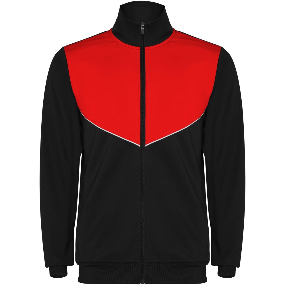 Könnyű és rugalmas anyagból készült melegítő. A végig cipzáros felső kontrasztos színű és varrású díszítésekkel dekorált a mellrészen. Oldalzsebek. Bordázott ujj- és és derékpasszé. Nadrág gumis derékkal és húzózsinórral, kontrasztos oldalsó varrással. Cipzáras szegély. Emblémázás: Hímzés, Szitanyomás