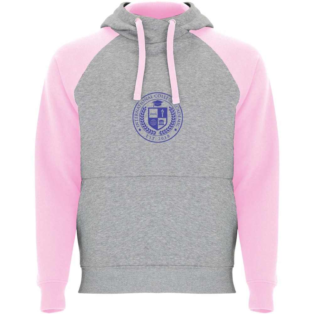 Két színű uniszex kapucnis pulóver. Kapucni keresztezett nyakrésszel és fém kiegészítőkkel. Kontrasztos belső rész a kapucnin, húzózsinór és raglán ujjak. Kenguru zseb. Rugalmas 1x1 passzék és alj. Levehető címke. Emblémázás: Hímzés, Szitanyomás