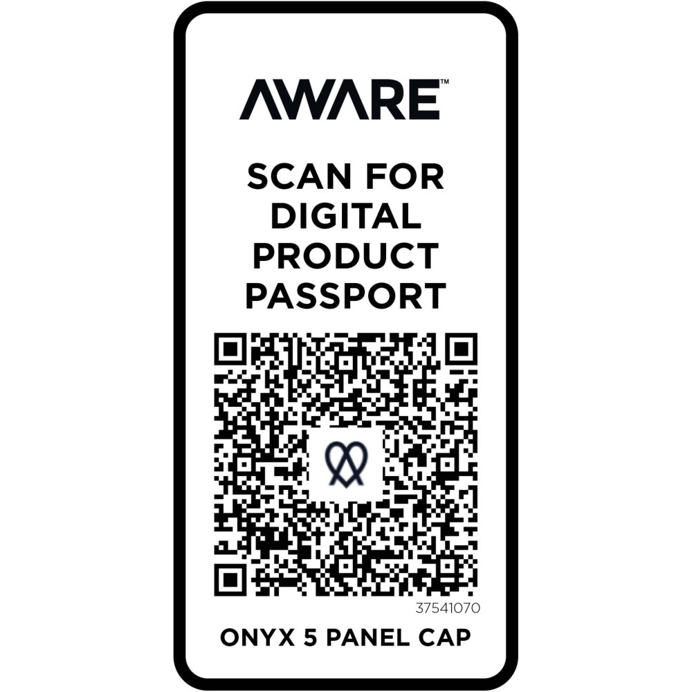 Az Onyx 5 paneles sapka 70%-ban újrahasznosított pamutból és 30%-ban újrahasznosított poliészterből készült. Úgy tervezték, hogy 58 cm-es fejkörfogatnál kényelmesen illeszkedjen, a fémcsatos záródás pedig könnyű és biztonságos beállítást tesz lehetővé. A sapka Cyclo újrahasznosított szálakat tartalmaz, ahol előválogatott hulladékot használnak, amely meghatározza a fonal színét. Ezek a szálak nem csak a szűz erőforrások iránti igényt csökkentik, hanem a körkörös élet iránti elkötelezettséget is mutatják, megtestesítve a hulladékcsökkentés lényegét. Minden sapkához egy Aware nyomjelző is tartozik. Ez az innovatív funkció lehetővé teszi a felhasználók számára, hogy egy QR-kód segítségével nyomon követhessék a termék eredetét és útját, növelve az ellátási lánc átláthatóságát, és elősegítve a termék és a gyártási folyamat közötti szorosabb kapcsolatot. Emblémázás: Hímzés, Szitanyomás