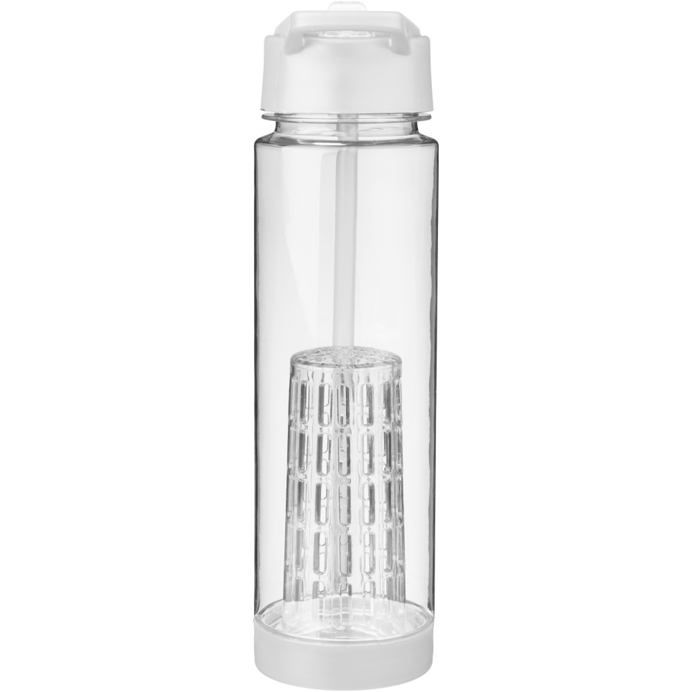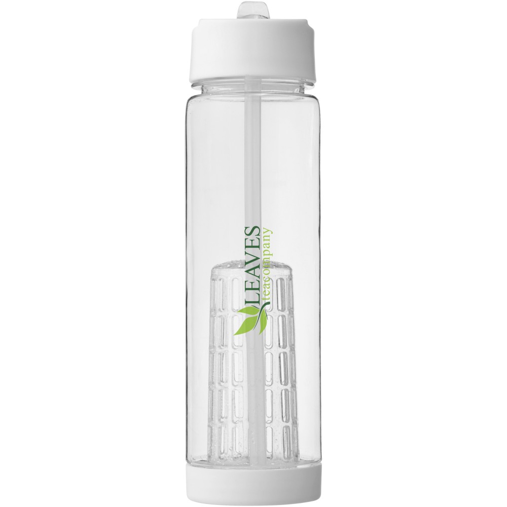 Tutti Frutti palack szűrőbetéttel, csavaros kupakkal, felpattintható ivócsővel. A szűrőbetétnek köszönhetően italunkba könnyen szűrhető módon tehetünk gyümölcsöt, zöldfűszert, zöldséget: mentát, citromfüvet, uborkát, levendulát, stb. A palack Eastman Tritan anyagból készült, így BPA-mentes, könnyű, tartós, szagmentes és ütésálló. Nem szivárgásmentes. Szénsavas italokkal nem használható. Mosogatógépben nem mosható és mikrohullámú sütőben történő melegítésre nem alkalmas. Űrtartalom: 740 ml. Emblémázás: Körszita, Tamponnyomás, UV nyomtatás