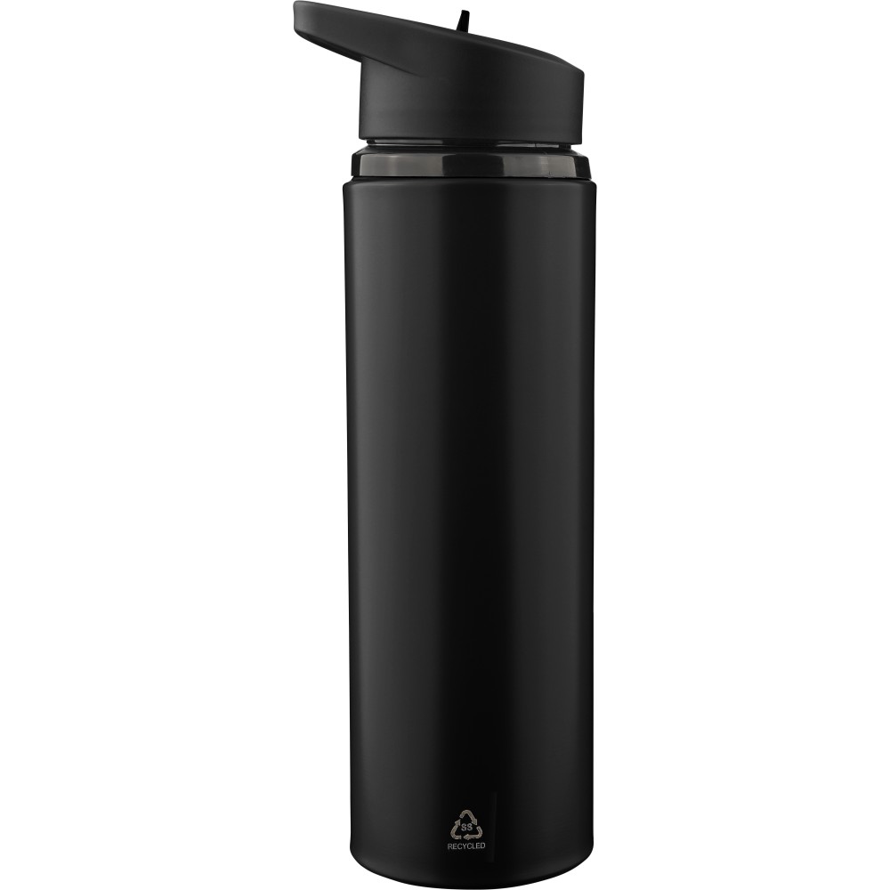 Újrahasznosított rozsdamentes acélból készült, egyfalú ivópalack rozsdamentes acél 304 anyagból, PP csavaros kupakkal, hordozófüllel, felhajtható ivószárral és belső szívószállal. Kizárólag hideg italokhoz használható, űrtartalma 500 ml. A palacktesten gravírozott recycled (újrahasznosított) alapanyagra utaló logó található. Darabonként barna kartondobozba csomagolva. Emblémázás: Bögredekor