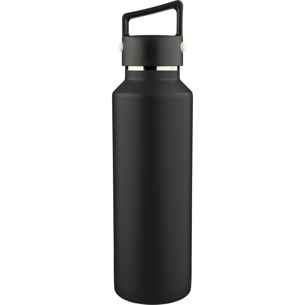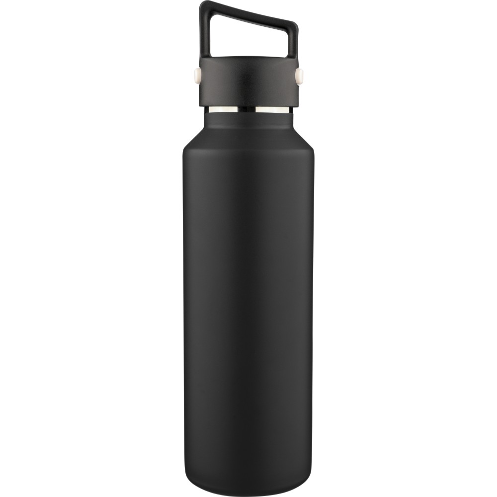 Újrahasznosított rozsdamentes acélból készült, vákuumszigetelésű palack 600 ml űrtartalommal, duplafalú kialakítással, hordozófüllel ellátott PP fedéllel és kétféle (dupla) nyitási lehetőséget biztosító nyomógombos rendszerrel. A palacktesten lézergravírozott recycled (újrahasznosított) alapanyagra utaló logó található. Darabonként barna kartondobozba csomagolva. Emblémázás: Bögredekor