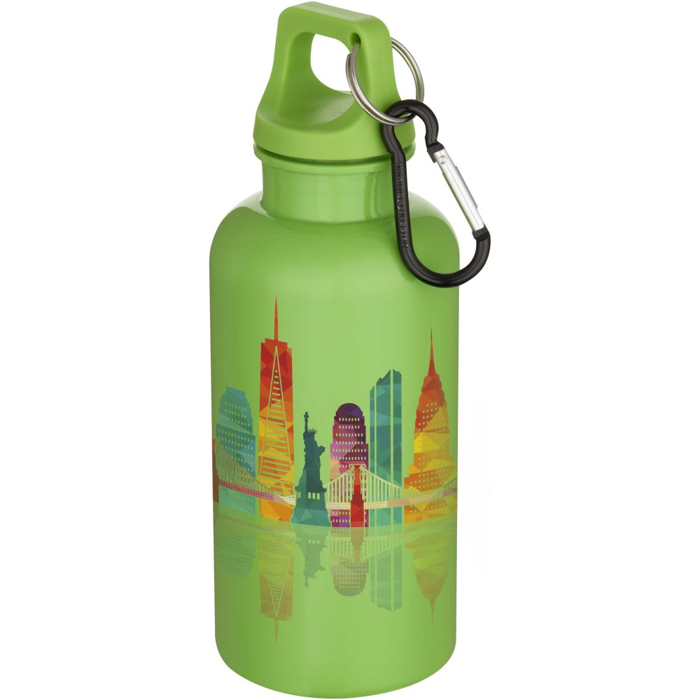 Az RCS tanúsítvánnyal rendelkező RPET-ből készült, tartós, mégis könnyű, 400 ml-es kulacs lehetővé teszi a folyamatos hidratálást. Tökéletes kísérő sportoláshoz, kirándulásokhoz vagy irodai használatra. A szimplafalú Oregon palack csavaros kupakkal rendelkezik, és bőséges felületet kínál bármilyen logó elhelyezésére. A mellékelt karabiner segítségével (mely mászásra nem alkalmas) a kulacs biztonságosan táskához rögzíthető. A termék megfelel az EFSA által jóváhagyott PET újrahasznosítási szabályoknak.