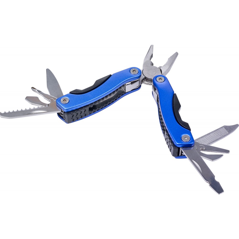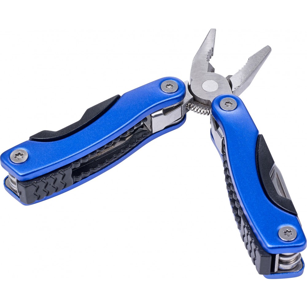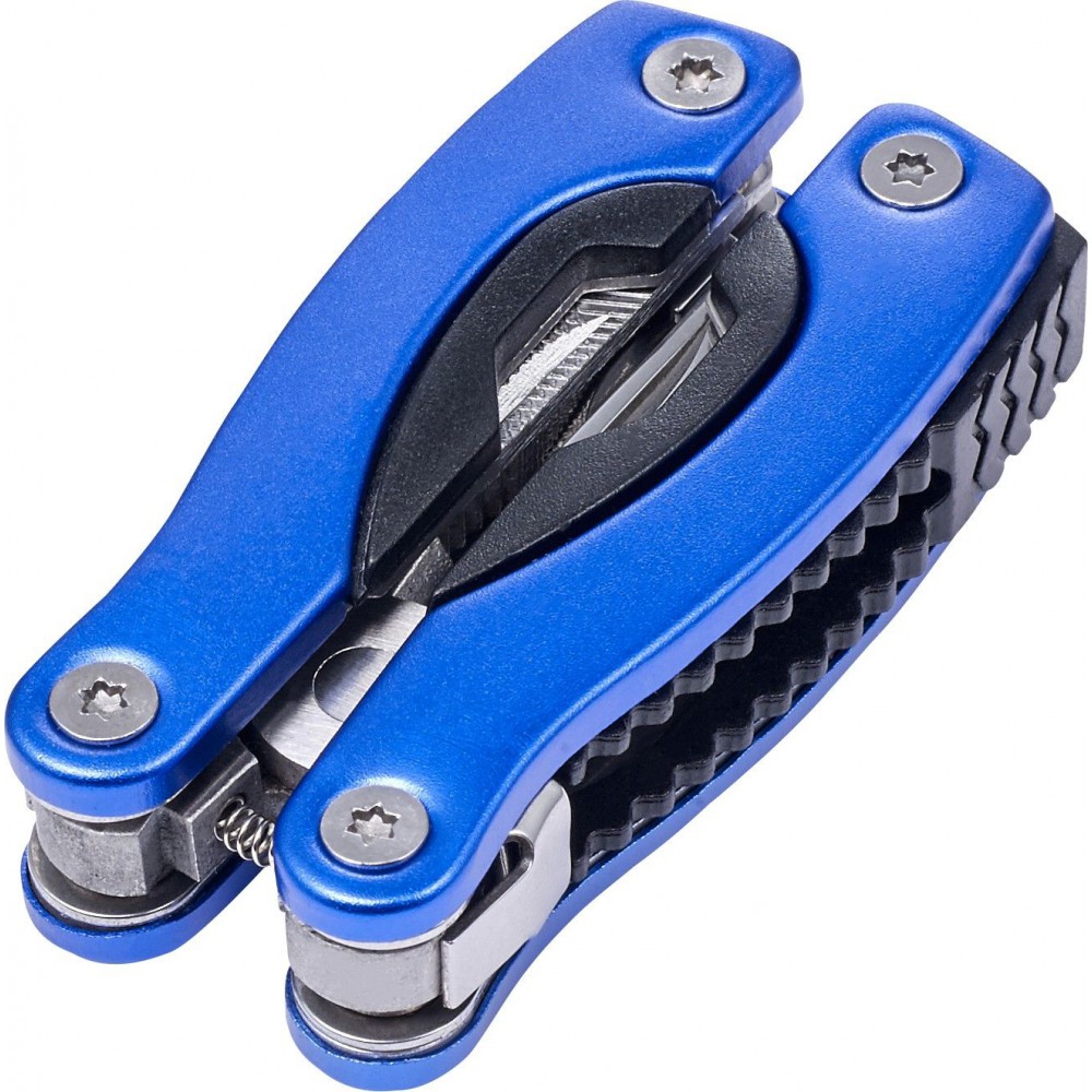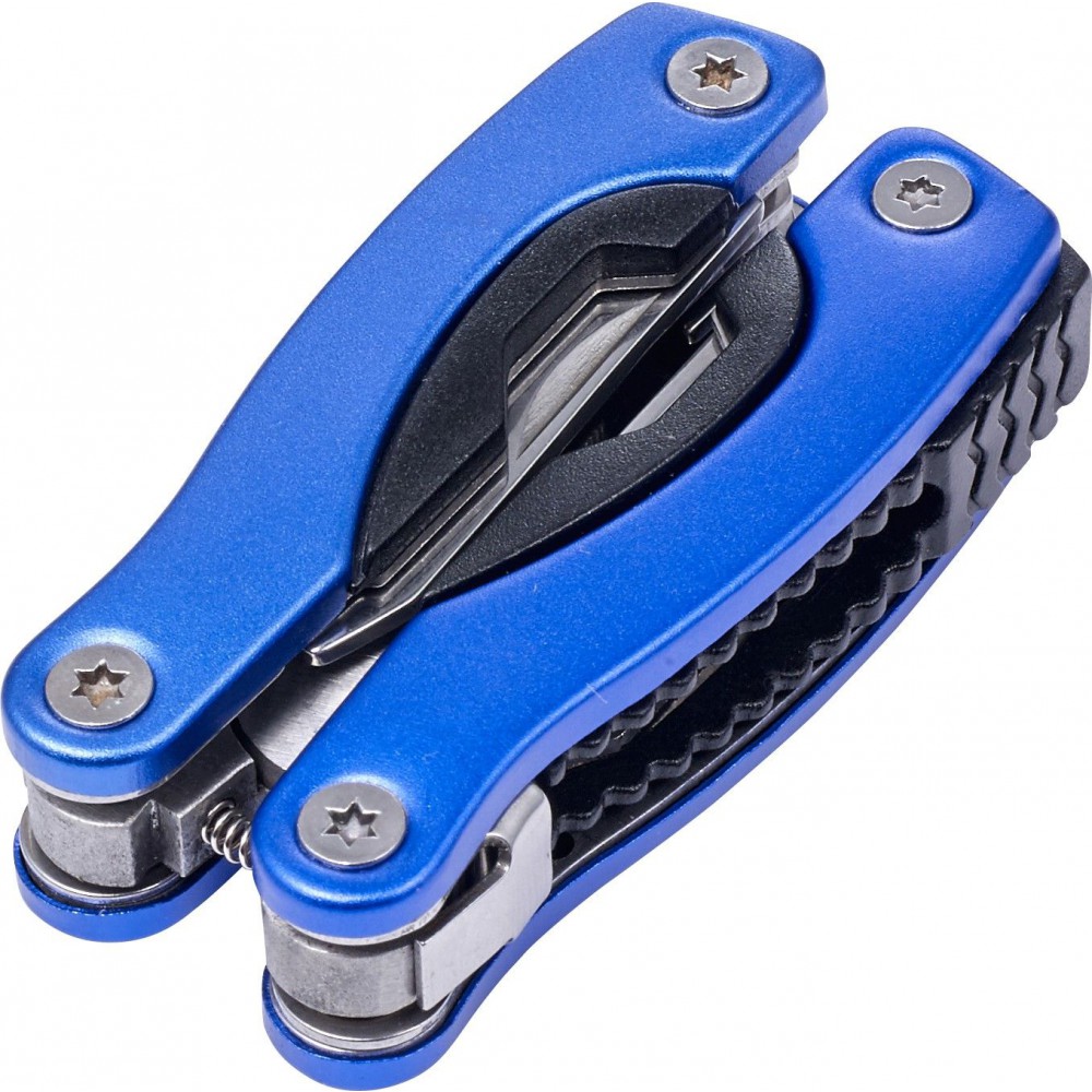 Kompakt multifunkciós szerszám. Funkciók: csavarhúzók (laposfejű és Phillips), reszelő, fűrész, kés, diótörő, doboznyitó és üvegnyitó. Alumínium, rozsdamentes acél Emblémázás: Gravírozás, Tamponnyomás
