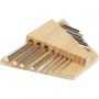 Az Allen bambusz imbuszkulcs készlet nélkülözhetetlen, akár barkácsprojektekkel foglalkozol, akár bútorokat szerelsz össze. A készlet 8 db, strapabíró szénacélból készült imbuszkulcsot tartalmaz, amelyek mind szilárdságot, mind korrózióállóságot biztosítanak. A 1,5 mm-től 6 mm-ig terjedő méretekkel kéznél lesz a megfelelő szerszám a különféle feladatokhoz. A bambusz tok nemcsak rendben tartja hatlapfejű kulcsait, hanem stílusos, praktikus és fenntarthatóbb kiegészítője a munkaterületnek. Mivel a bambusz természetes alapanyag, darabonként előfordulhatnak kis szín- és méretbeli eltérések, ami befolyásolhatja a végső emblémázási eredményt. Fenntartható forrásból származó STAC díszdobozba csomagolva. Emblémázás: Gravírozás, Tamponnyomás