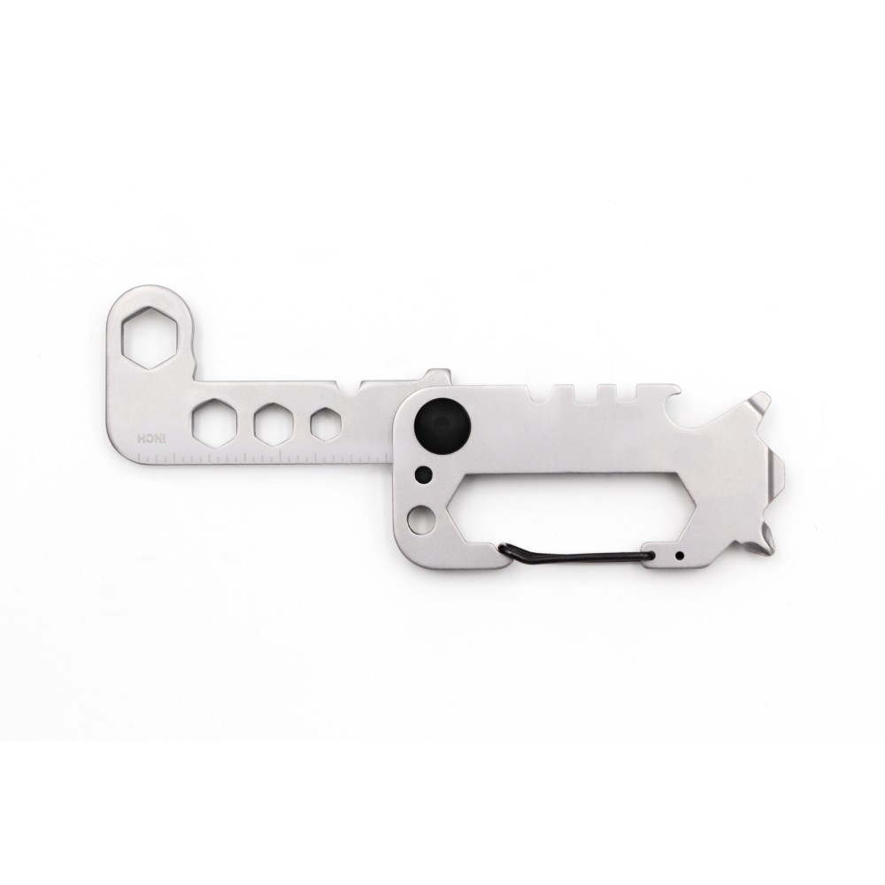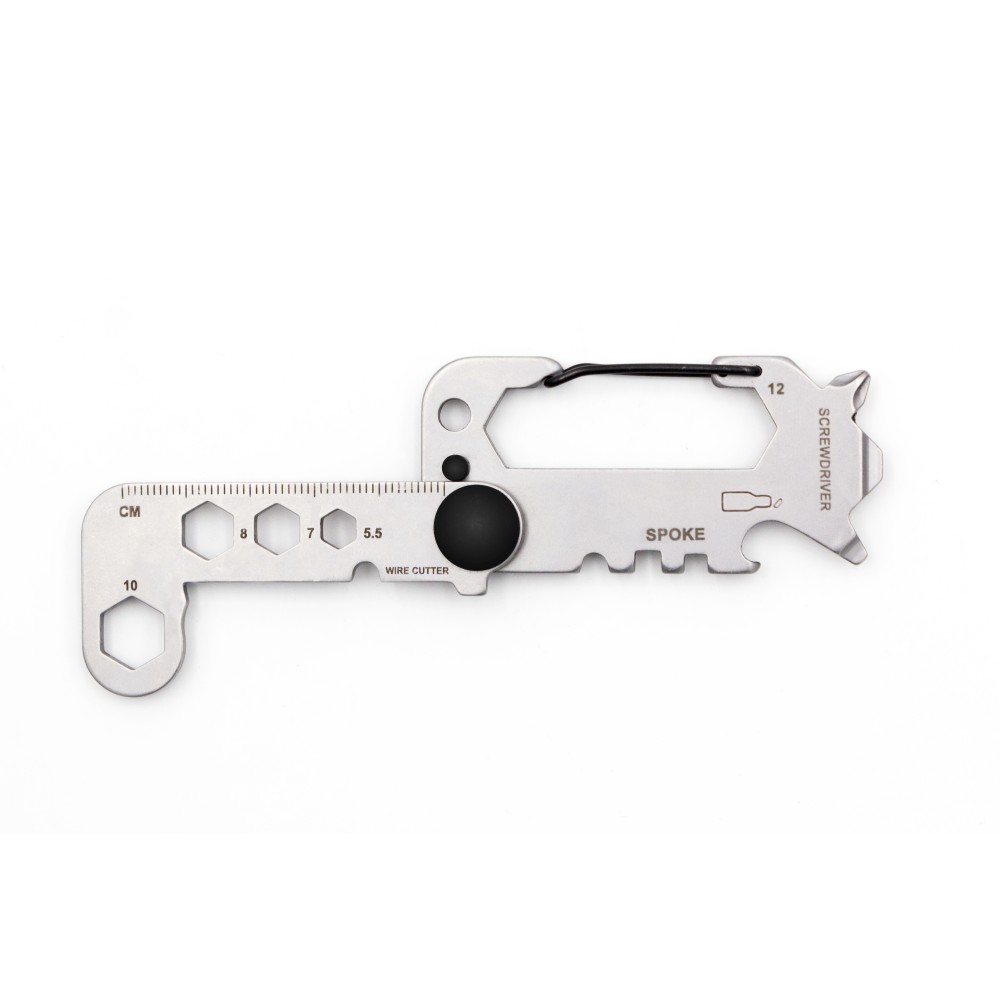 Az edzett 420-as martenzites rozsdamentes acélból készült Twist többfunkciós szerszám a bicklisták kedvence lesz. 8 alapvető szerszámot egyesít egy kompakt csavaros kialakításban, amely kényelmesen illeszkedik a kezedbe. Ez a sokoldalú eszköz tartalmaz egy drótvágót, kerékpárküllős csavarkulcsot, több villáskulcsot (5,5-12 mm), kulcstartót, sörnyitót, karabinerkampót, csillagfejű és lapos csavarhúzókat, valamint egy vonalzót. Fekete dobozba csomagolva puha habszivacs betéttel a védelem érdekében, egyszerre elegáns és praktikus, ideális a mindennapi feladatokhoz. Emblémázás: Gravírozás