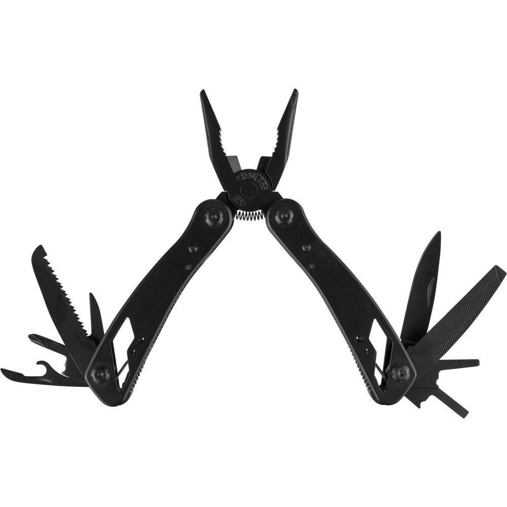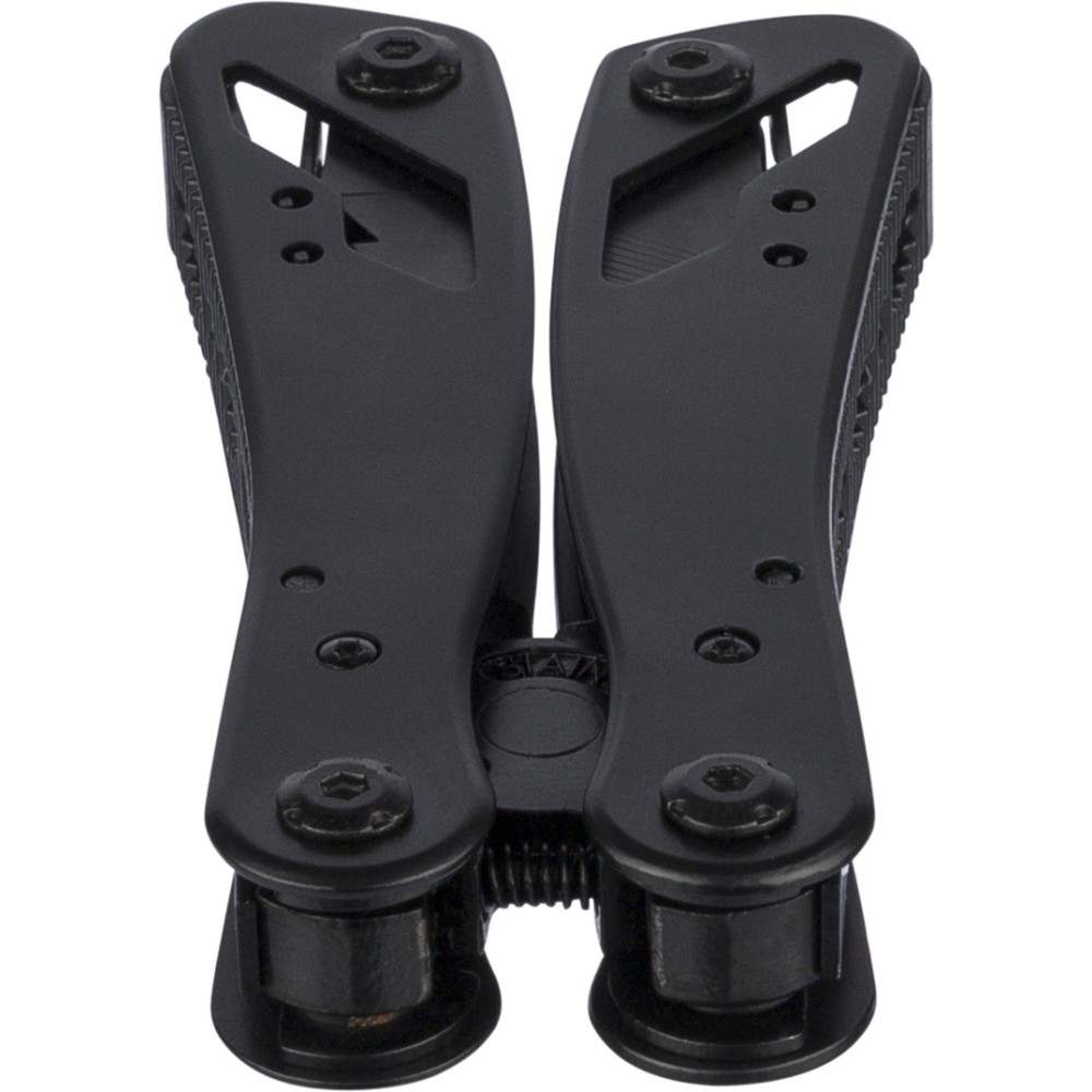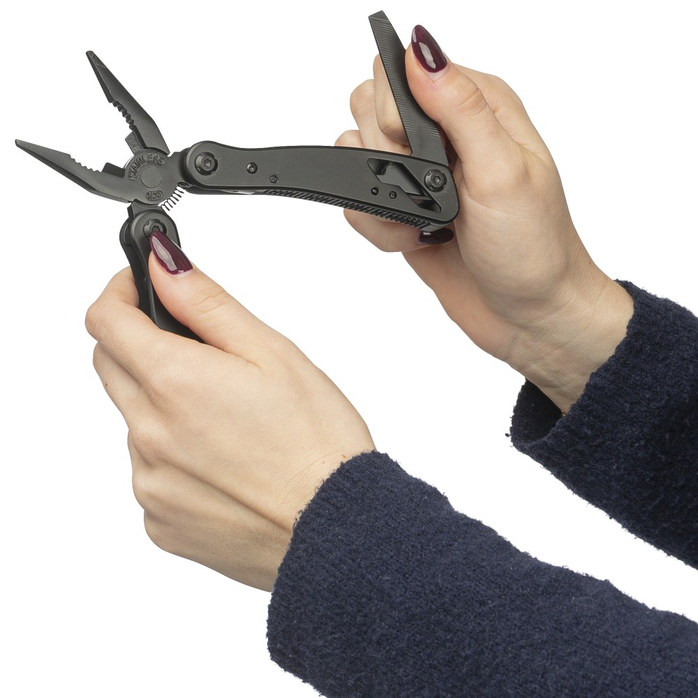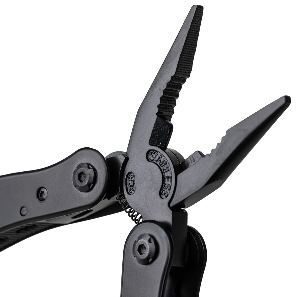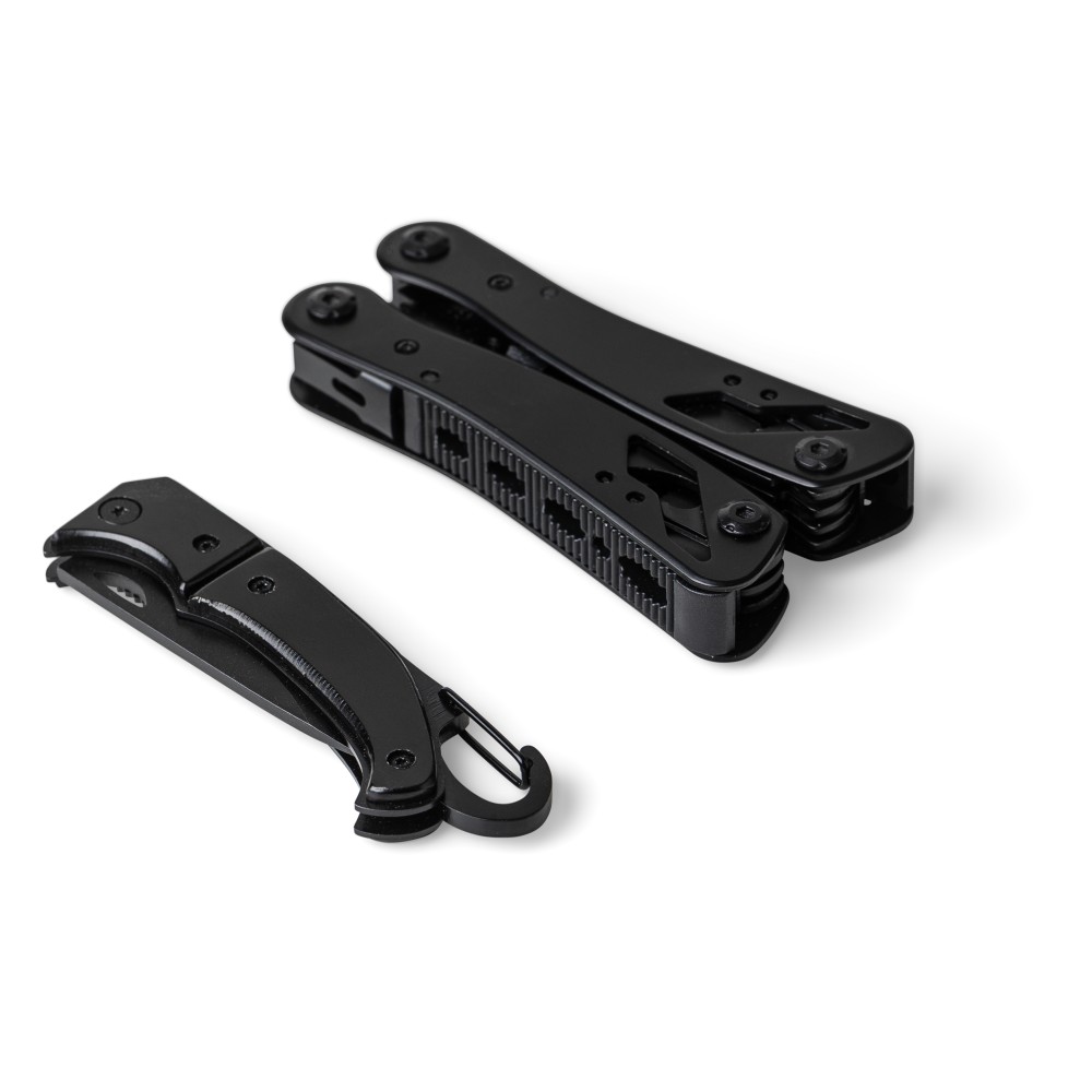 Fekete alumíniumból és rozsdamentes acélból készült multifunkciós szerszám 13 funkcióval, beleértve a késeket, csavarhúzókat, fogót, fűrészt, reszelőt, emelőkart, biteket, rugót, rögzítőrudat, konzervnyitót és támasztékot. Tokkal szállítva, amely tépőzáras övbújtatóval rendelkezik, valamint további külső dobozzal. Darabonként barna kartondobozba csomagolva.