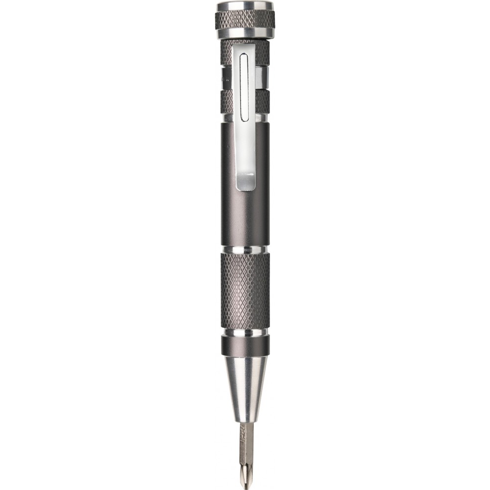Tartalma: toll alakú csavarhúzó, 4 db sima csavarhúzó, 4 db csillagcsavarúzó fej, 3 LED-es zseblámpa és kulcstartó. Az elemet tartalmazza. Emblémázás: Gravírozás, Tamponnyomás