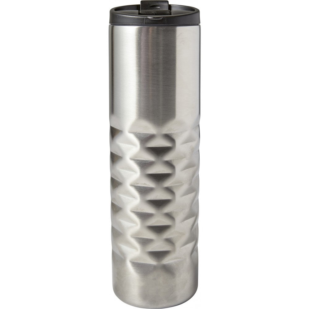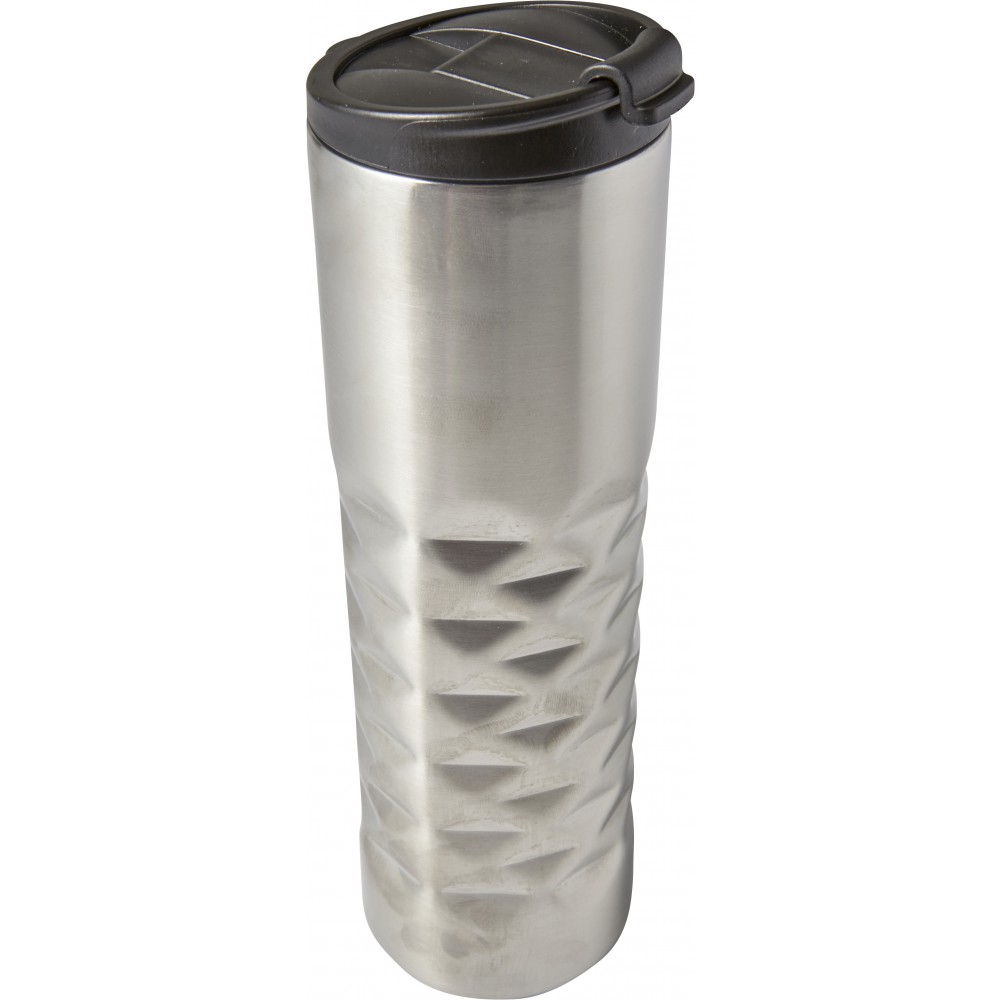 Duplafalú termoszbögre gyémánt mintázattal. Nem szivárgásmentes. Mosogatógépben nem tisztítható. 460 ml. Rozsdamentes acél és BPA-mentes műanyag. Emblémázás: Bögredekor, Gravírozás, Körszita, Tamponnyomás