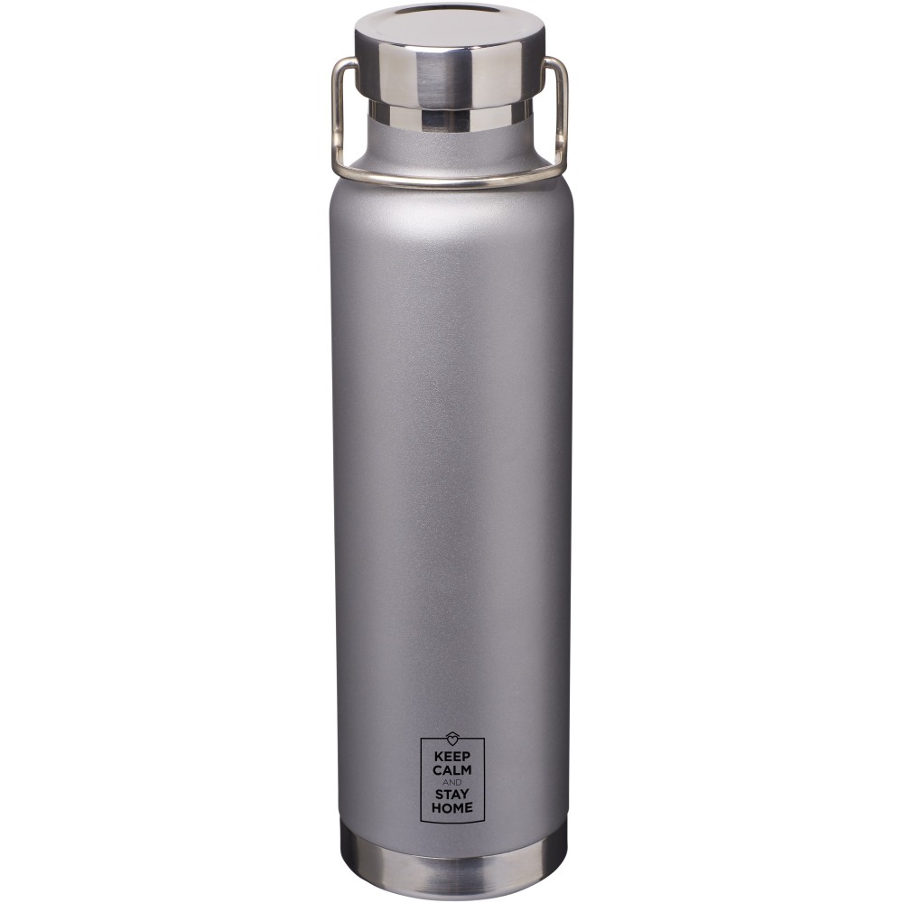 Thor duplafalú vákumos palack. Belső fala réz, ennek köszönhetően 48 órás hideg- és 12 órás melegtartási képességgel rendelkezik. Ez a kialakítás megakadályozza a kondenzációt a palack külső falán. A termoszhoz csavaros, rozsdamentes acél kupak tartozik. Széles kiöntő nyílással rendelkezik, amely akár jégkockák behelyezésére is alkalmas. Szivárgásmentes. Szénsavas italokkal nem használható. Mosogatógépben nem mosható és mikrohullámú sütőben történő melegítésre nem alkalmas. Űrtartalom: 650 ml. Csomagolása Avenue díszdoboz. Rozsdamentes acél. Emblémázás: Gravírozás, Tamponnyomás