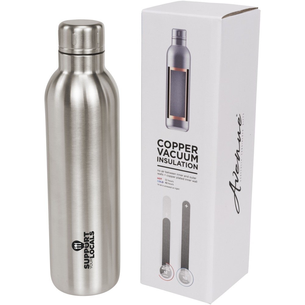 Erős, duplafalú, vákuumos palack, réz szigeteléssel. Hidegtartó képesség 48 óra, melegtartó képesség 12 óra. A duplafalas kialakításnak köszönhetően nincs külső vízlecsapódás. Trendi, matt bevonat. Rozsdamentes, csavaros, cseppmentes kupak. Szivárgásmentes. Szénsavas italokkal nem használható. Mosogatógépben nem mosható és mikrohullámú sütőben történő melegítésre nem alkalmas. Űrtartalom: 510 ml. csomagolás: Avenue doboz. Emblémázás: Bögredekor, Gravírozás, Körszita, Tamponnyomás