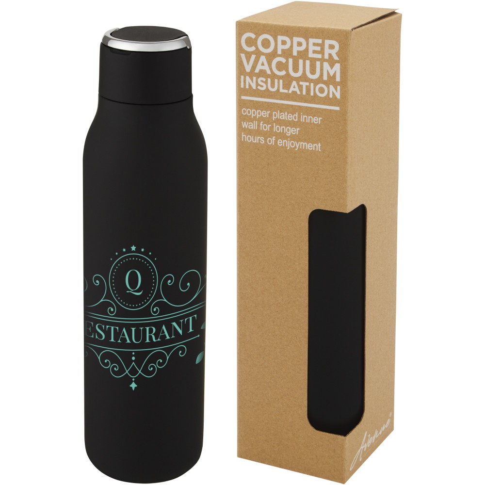 A Marka palack rozsdamentes acél vákuumkonstrukcióval és rézszigeteléssel rendelkezik, amely több órán keresztül melegen vagy hidegen tartja az italokat. A szigetelt 18/8-as rozsdamentes acél konstrukció megakadályozza a páralecsapódást a palack külső oldalán, a divatos porszórt felület pedig extra tartóssá teszi. Felcsavarható fedéllel és tartós, cinkötvözetből készült fogóval is rendelkezik. BPA-mentes, a német élelmiszerbiztonsági törvény (LFGB) szerint tesztelt és jóváhagyott. Ftaláttartalomra tesztelve és jóváhagyva a REACH előírásai szerint. A legtöbb szabványos autós pohártartóba illeszkedik. Szivárgásmentes. Szénsavas italokkal nem használható. Mosogatógépben nem mosható és mikrohullámú sütőben történő melegítésre nem alkalmas. Űrtartalom: 600 ml. Újrahasznosított karton díszdobozban. Emblémázás: Bögredekor, Gravírozás, Tamponnyomás, UV nyomtatás
