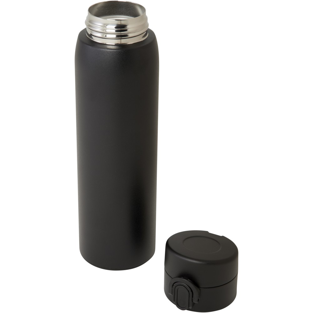 Stílusos, RCS tanúsítvánnyal rendelkező újrahasznosított rozsdamentes acélból készült, szigetelt palack gombos nyitómechanizmussal. A flaska szivárgásmentes és a réz vákuumszigetelésnek köszönhetően az italokat több órán keresztül forrón vagy hidegen tartja. Űrtartalom: 450 ml. Újrahasznosított kartonból készült díszdobozban szállítjuk. Emblémázás: Gravírozás