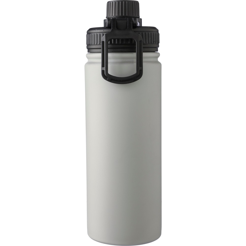 Duplafalú palack PP fedéllel, PP csavaros adagolóval és hordozófogantyúval. A belső rész 304-es, a külső 201-es rozsdamentes acél . Egyedi csomagolásban, barna kartondobozban. Űrtartalom: 500 ml. Emblémázás: Gravírozás