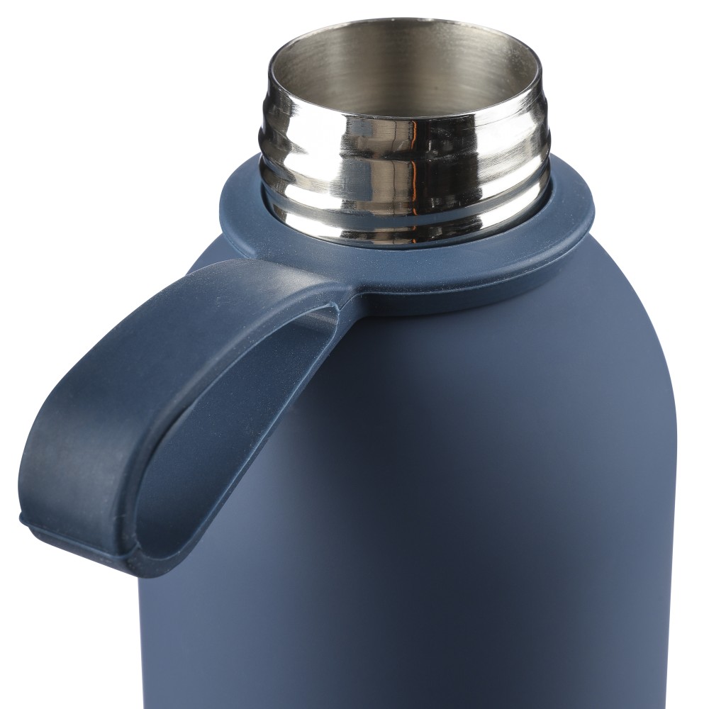 Újrahasznosított rozsdamentes acélból készült duplafalú vákuumpalack, 500 ml-es. 304-es rozsdamentes acél belsővel és 201-es rozsdamentes acél külsővel. Gumírozott felülettel, fém díszítésű csavaros PP kupakkal és szilikon hordfüllel. Gravírozott, újrahasznosított logóval. Csomagolása barna papírdoboz. Emblémázás: Gravírozás