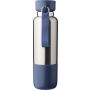 Duplafalú rozsdamentes acél kulacs, 500 ml-es. 304-es rozsdamentes acél belsővel és 201-es rozsdamentes acél külsővel. Átlátszó rekesszel ellátott PP csavaros kupakkal, cserélhető poliészter csuklópánttal, valamint egy 200 ml-es PP pohárral az alján. Ezüst színű felület matt részletekkel. Csomagolása barna papírdoboz. Emblémázás: Gravírozás
