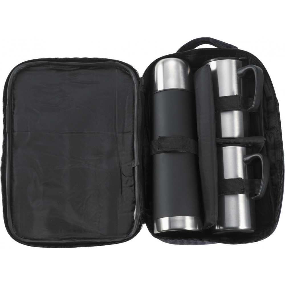 500 ml-es termosz 2 db duplafalú, 260 ml-es bögrével. Rozsdamentes acél, nylon tokban. Nem szivárgásmentes. Mosogatógépben nem tisztítható. Emblémázás: Gravírozás, Szitanyomás, Tamponnyomás