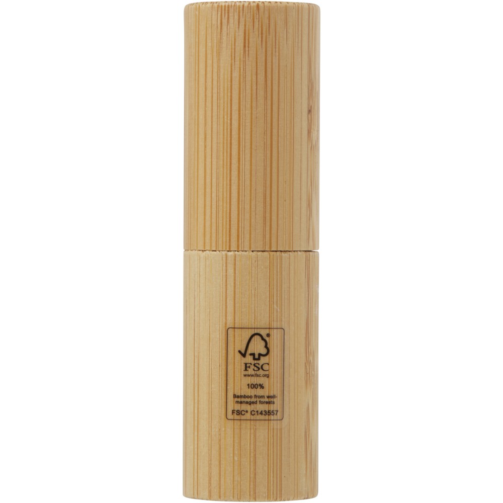 Ajakápoló. Védelmet nyújt a nap ultraibolya (UV) sugarai ellen. Úgy tervezték, hogy hidratálja és védje az ajkakat. A külső burkolat bambuszból készült. Jó választás magánszemélyek és vállalkozások számára, akik a fenntarthatóbb ternékeket részesítik előnyben. Az illata vanília. Szavatosság: vásárlástól számított 3 év. Bambusz. FSC 100% N5 CU-COC-877277. Emblémázás: Gravírozás