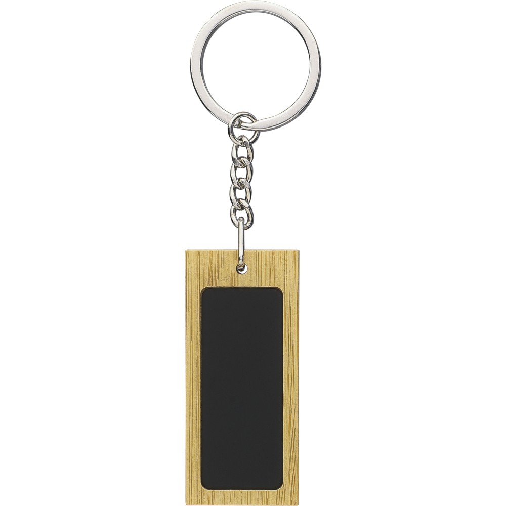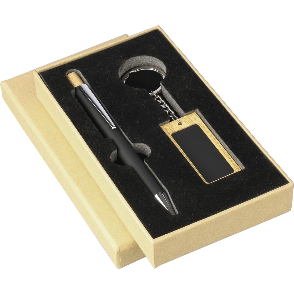 Bambusz írószerkészlet, amely egy bambuszból és gumírozott, újrahasznosított alumíniumból készült golyóstollat tartalmaz kék tintával, bambusz nyomógombbal és krómozott műanyag heggyel. Bambuszból és gumírozott rozsdamentes acélból készült téglalap alakú kulcstartóval. Mindkét termék felülete lézergravírozás után tükörhatású lesz, és újrahasznosított alumínium logóval van ellátva. Bársonyberakásos, kraftpapír dobozban csomagolva. Emblémázás: Gravírozás