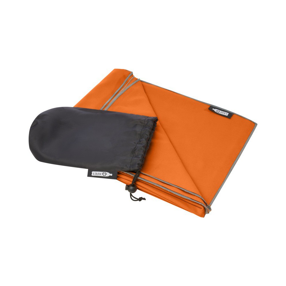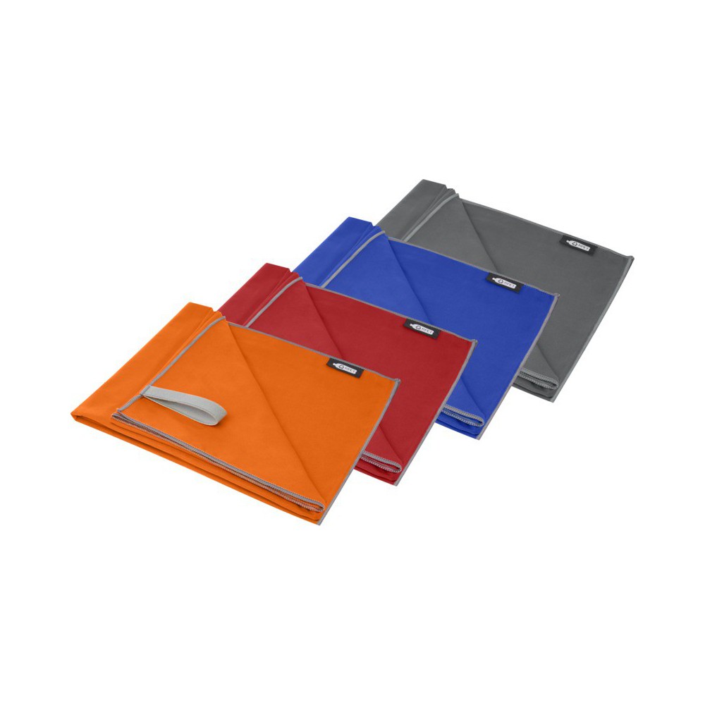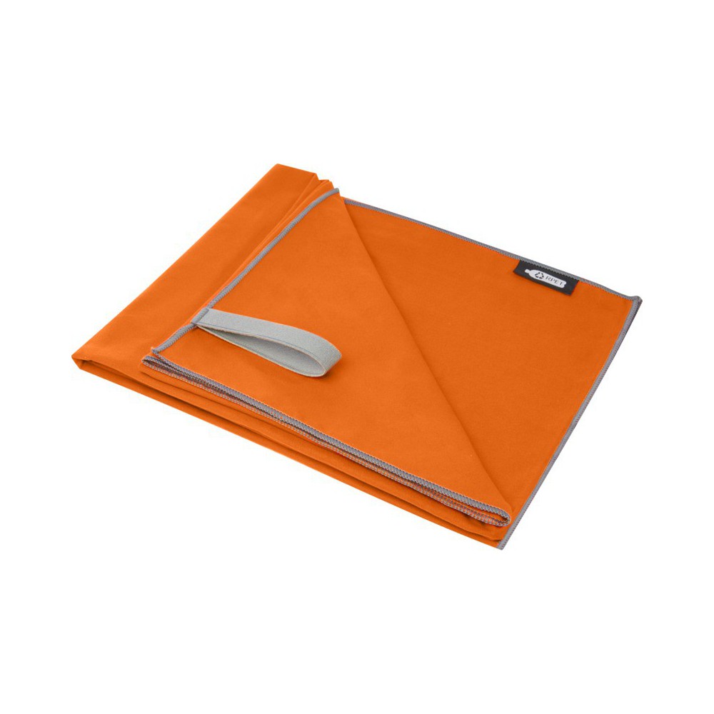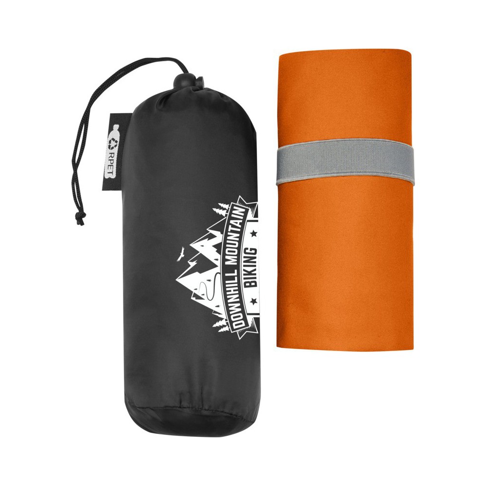 Ez a sporttörölköző nagyon jó nedvszívó, könnyű és gyorsan szárad. Ha a törölközőt összehajtjuk és gumiszalaggal rögzítjük, kis mérete miatt alkalmas edzőterembe, uszodába, vagy kempingezésre. A törölköző 130 x 80 cm méretű, 200 gr/m2-es újrahasznosított PET poliamidból készült, mosógépben 40°C-on mosható. Újrahasznosított PET műanyagból készült tároló tasakkal (20 x 8,5 cm) szállítjuk, amely remek helyet biztosít a logó nyomtatásához. Emblémázás: Hímzés, Szitanyomás