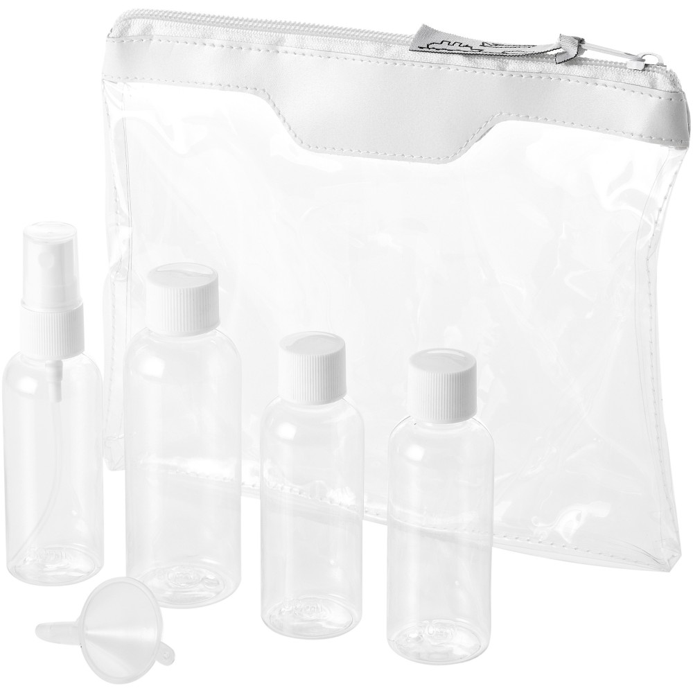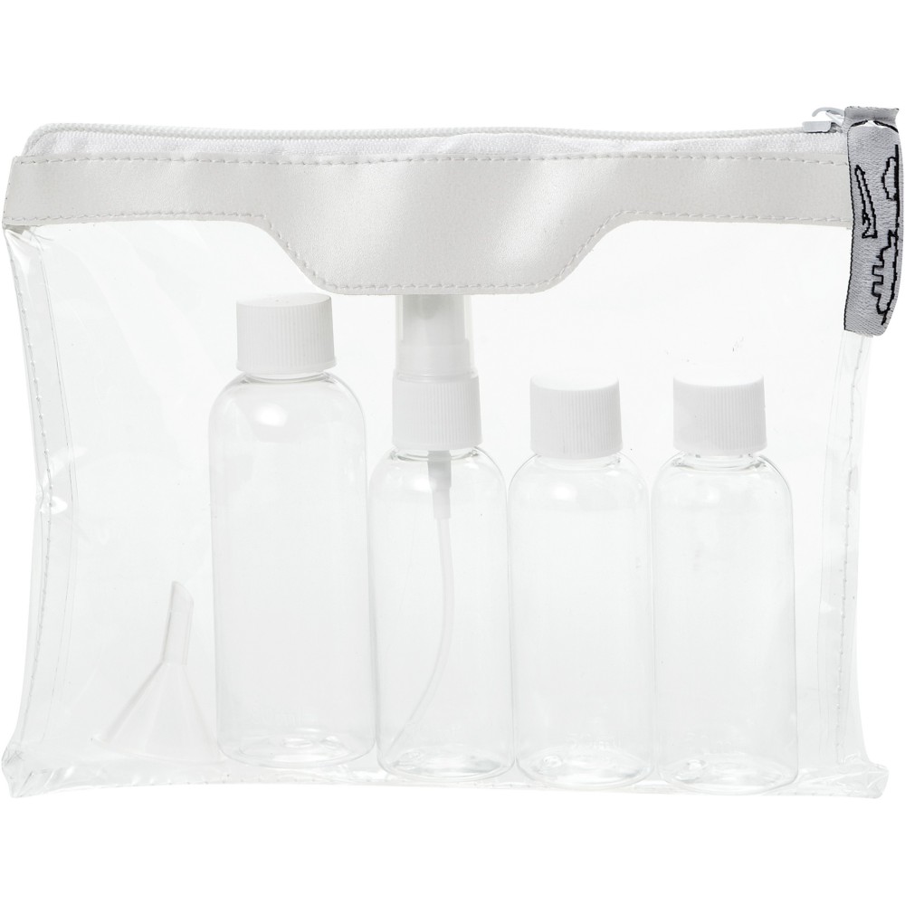 Légitársaságok által jóváhagyott tisztaságcsomag, amit magával vihet a fedélzetre. Tartalma: 2 x 50 ml-es flakon, 1 x 90 ml-es flakon, 1 permetező és 1 tölcsér. A flakonok, a permetező és a tölcsér polietilén zacskóban, elkülönítve a tasaktól. Az alkotórészekre nem lehetséges dekoráció. Emblémázás: Szitanyomás, Tamponnyomás