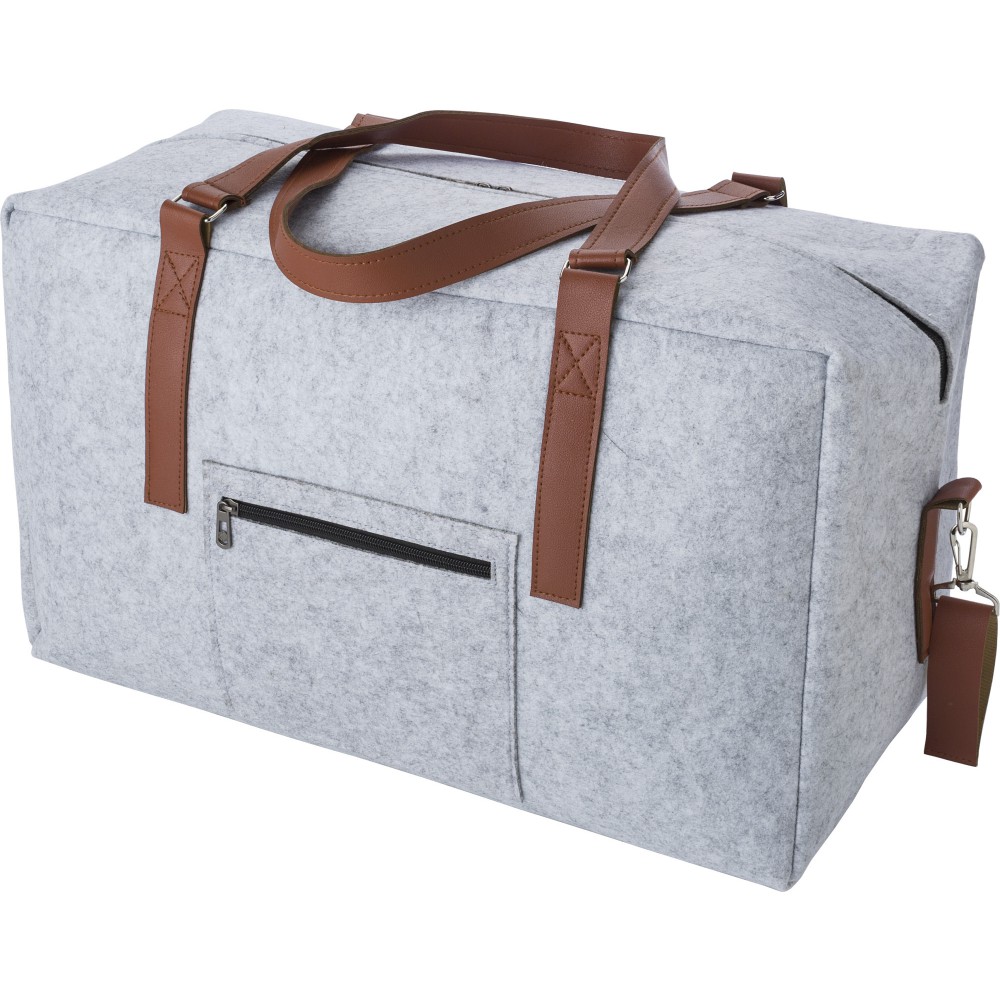 RPET filcből készült utazótáska PU részletekkel. Egy nagy rekesz cipzárral, kis zseb cipzár nélkül. Emblémázás: Szitanyomás