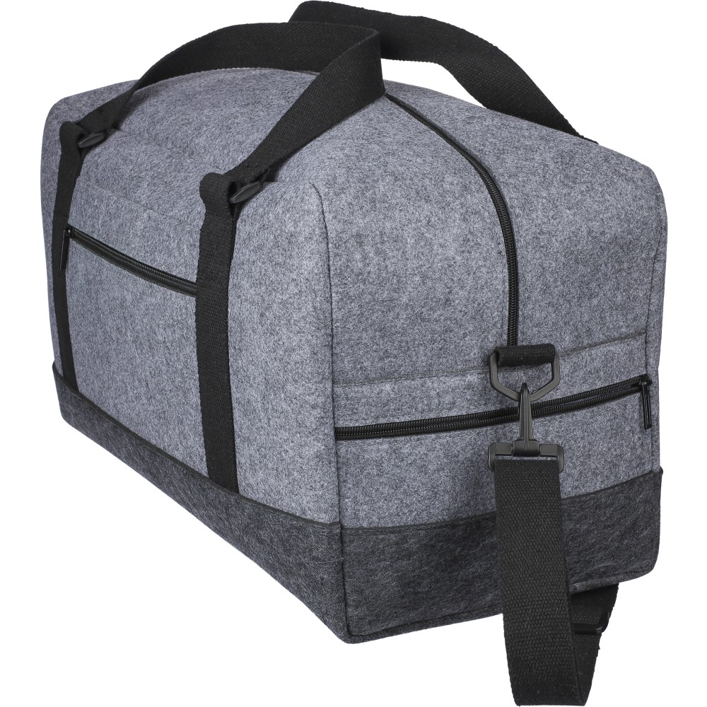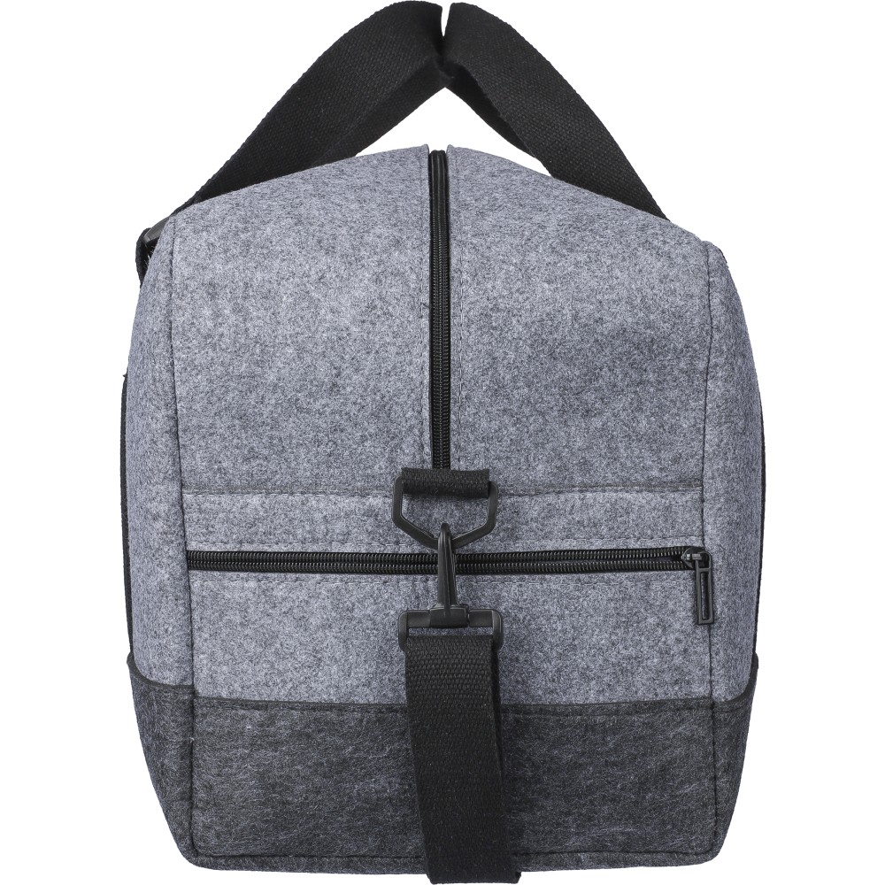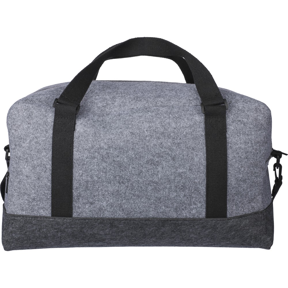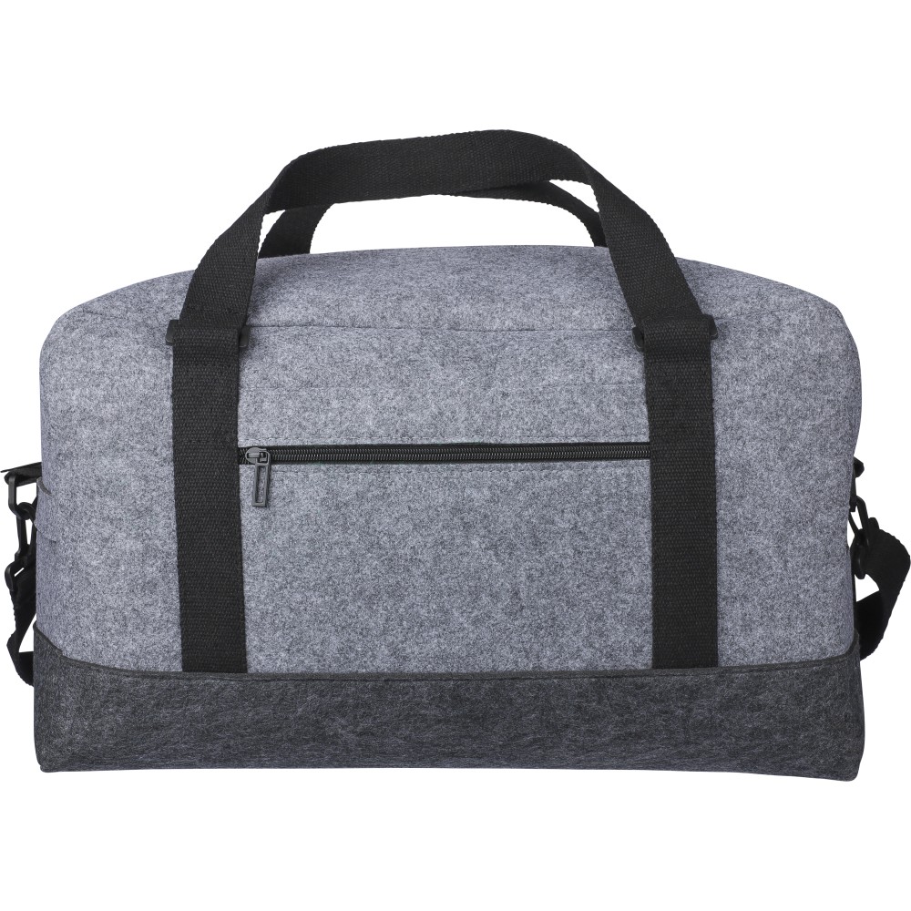 Sporttáska rPET filc anyagból vászon fülekkel és állítható vállpánttal. Egy nagy cipzáras rekesszel és a táska elején egy kicsi cipzáras zsebbel. rPET címkével. Úrtartalom: 30 liter, teherbíró képesség: 10 kg. Emblémázás: Szitanyomás