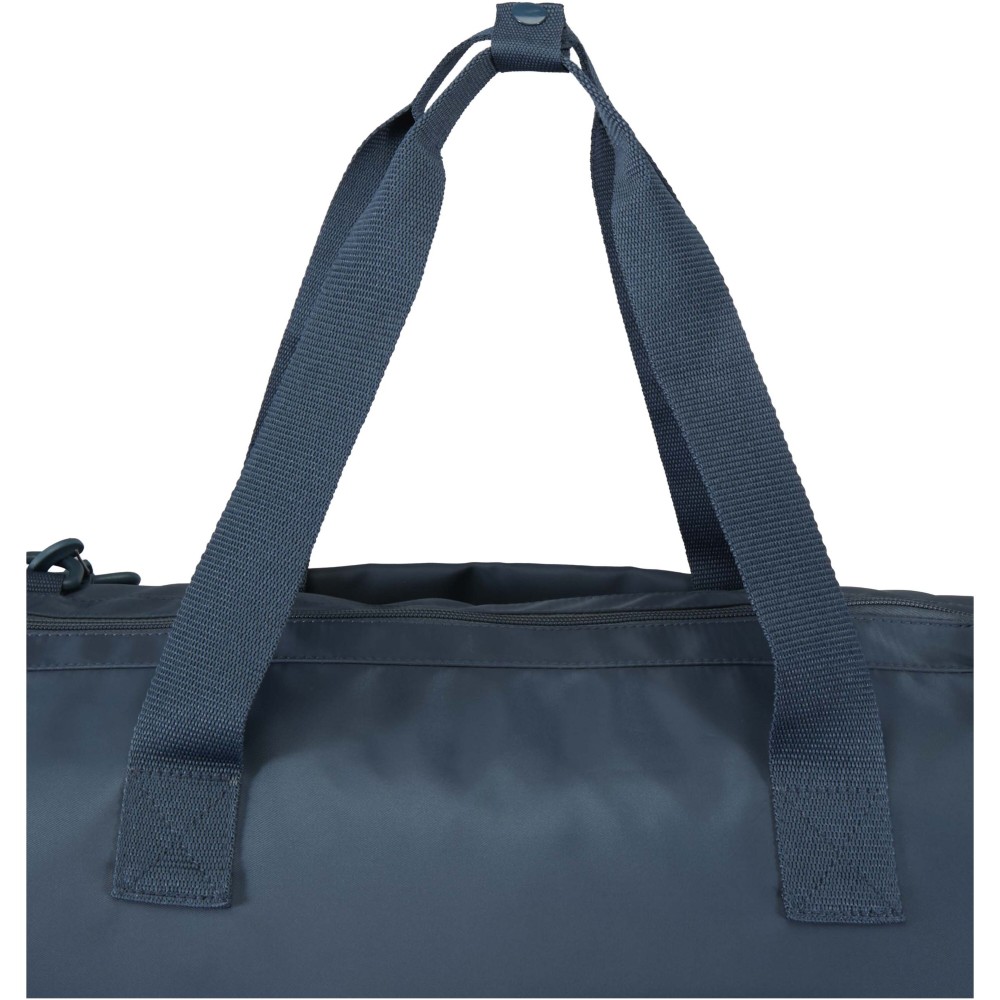 A Trip Aware® újrahasznosított utazó sporttáska sokoldalú és tágas társ, ideális rövid kiruccanásokhoz, valamint a szükséges holmik kényelmes szállításához. Tartós 290D twill poliészterből készült, puha kötött hátoldallal, RPET 210D/PU béléssel, így praktikus használatot és kényelmet biztosít. Fő rekesze nagy cipzáras zsebet tartalmaz, útlevél, tollak és kulcstartó szalag számára kialakított hellyel, valamint két belső nyitott zsebbel és dupla kulacstartóval. Külön alsó rekesze kagylószerűen nyílik, tökéletes cipők vagy egyéb felszerelések elkülönített tárolására. Minden táska Aware® nyomkövetővel érkezik, amely QR-kód segítségével lehetővé teszi a termék eredetének és útjának nyomon követését, növelve az ellátási lánc átláthatóságát és a kapcsolatot a termék gyártási folyamatával. Űrtartalom: 42 liter. Emblémázás: Szitanyomás