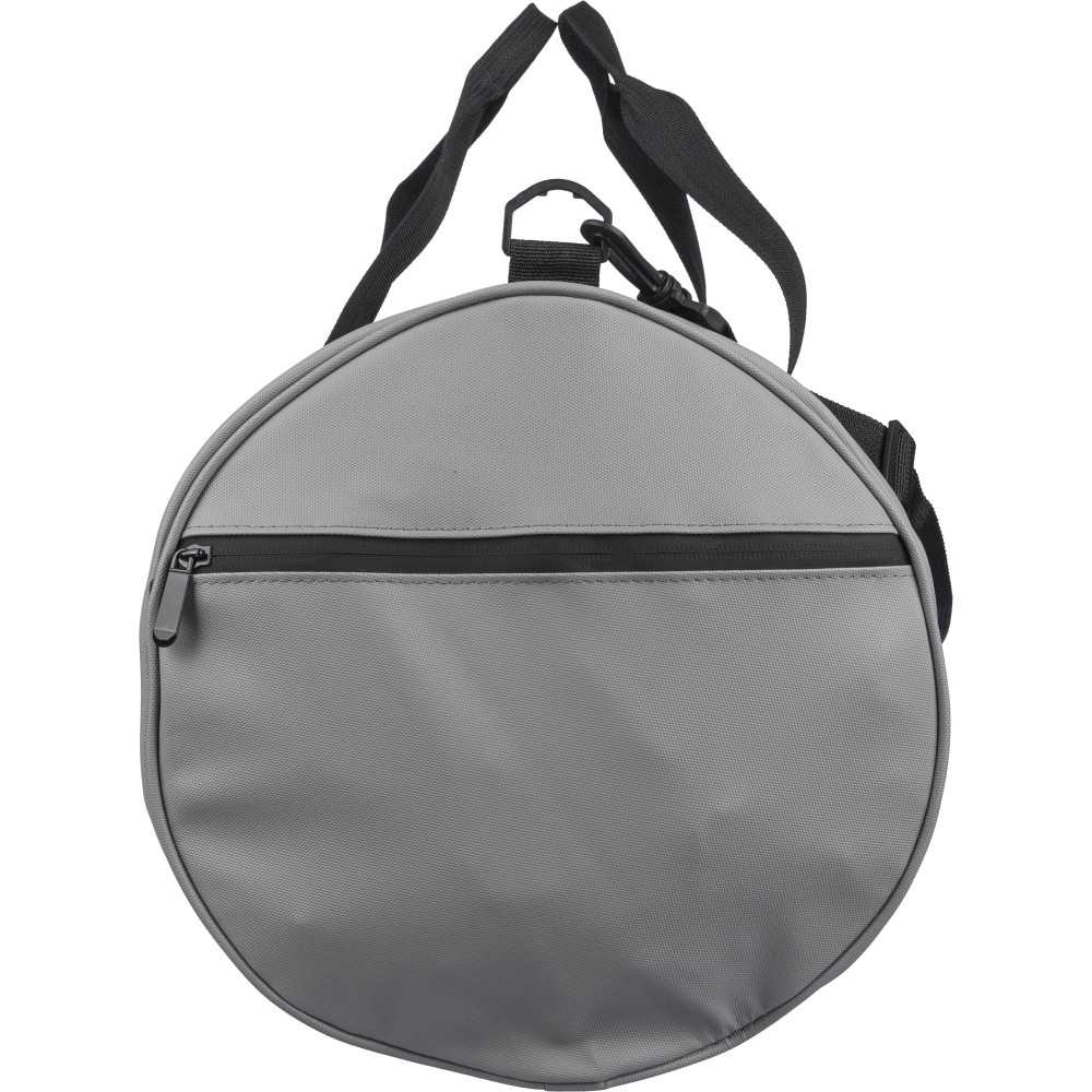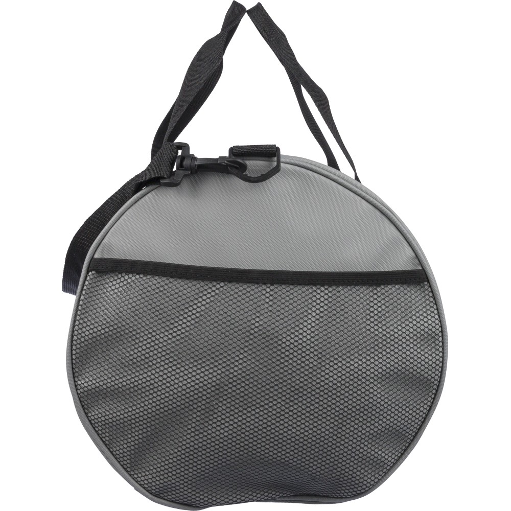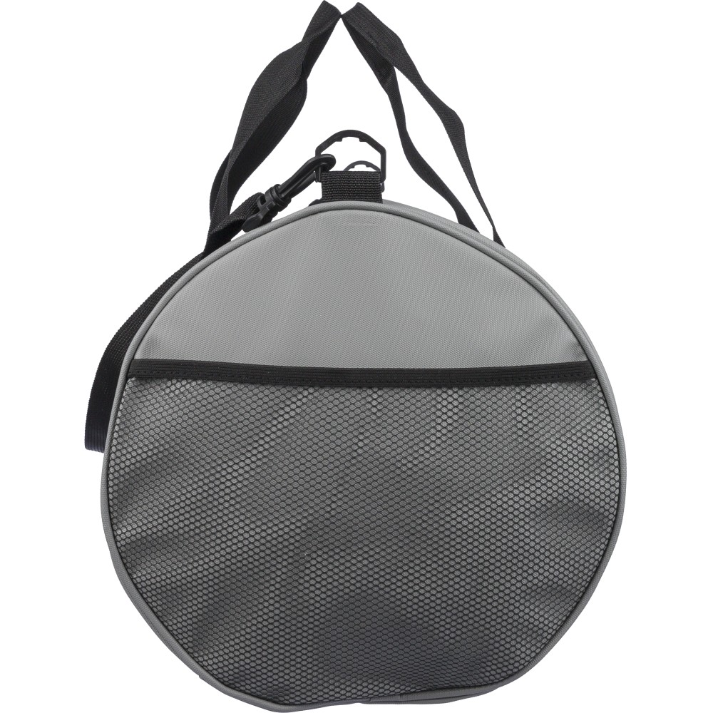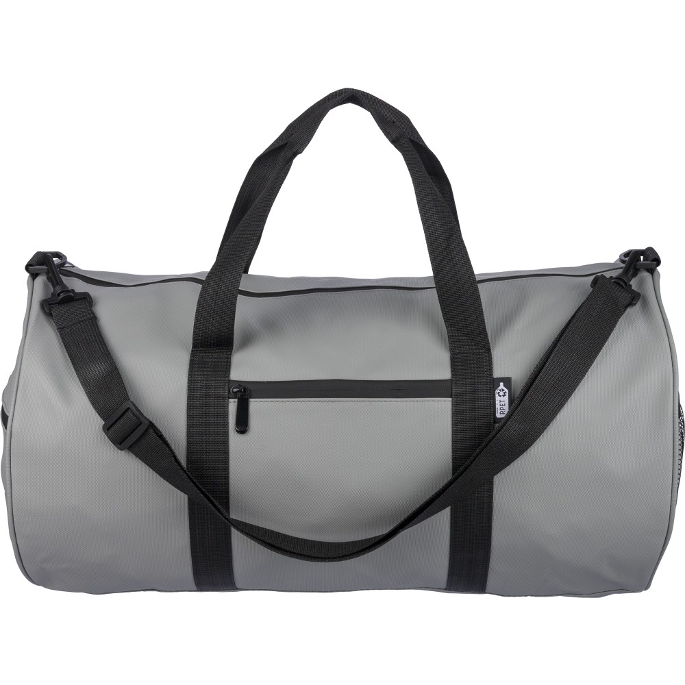 600D poliészterből készült rPET sporttáska 210D béléssel és vízlepergető PU bevonattal, 40 literes űrtartalommal. Elülső és oldalsó cipzáras zsebbel, hálós oldalzsebbel, két fogantyúval és állítható vállpánttal rendelkezik. Külső felületén rPET címkével ellátva. Emblémázás: Szitanyomás