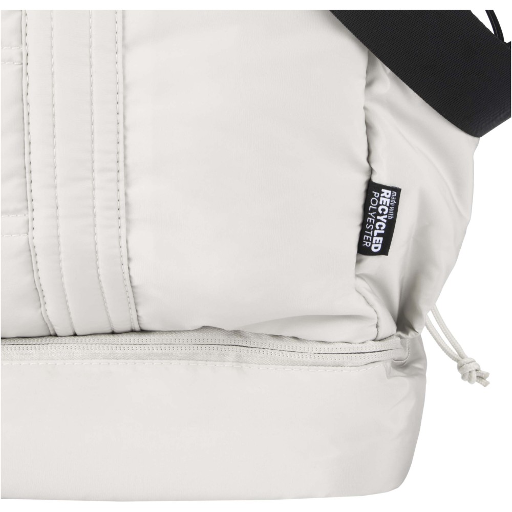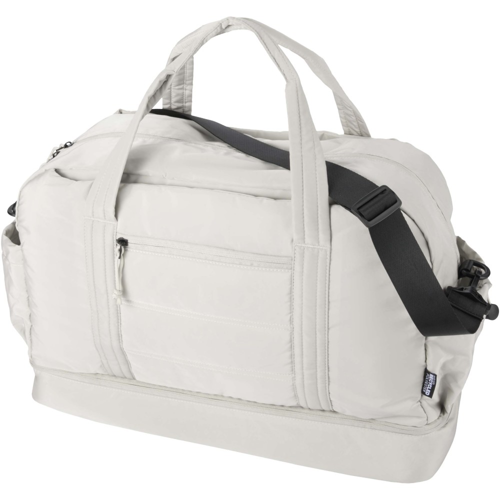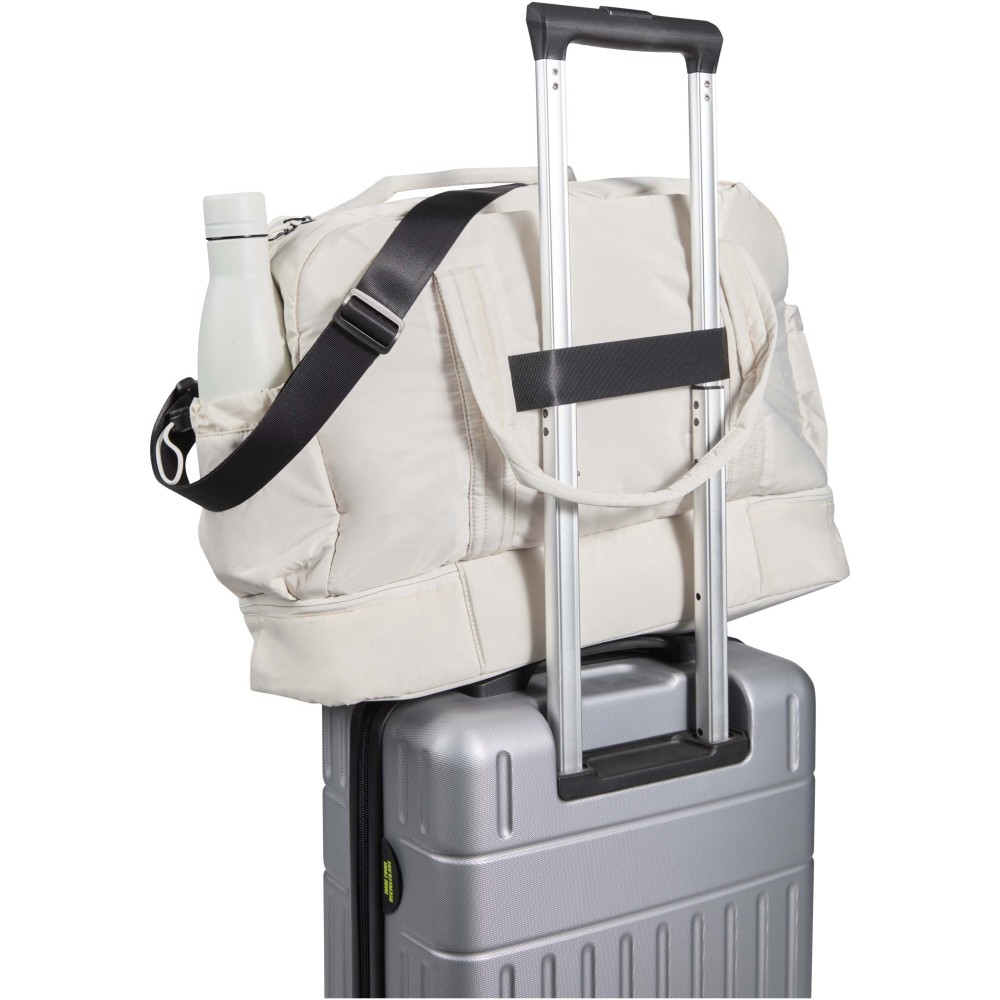 A Puffer sporttáska egyedi megjelenést ötvöz prémium minőségű, GRS tanúsítvánnyal rendelkező újrahasznosított alapanyagokkal, így ideális választás a mindennapi használathoz. A 30 literes űrtartalom tökéletes rövid utazásokhoz, edzéshez vagy hétköznapi teendőkhöz. A táska tágas, cipzáras fő rekesszel rendelkezik ruhák és felszerelések számára, valamint egy szigetelt, PEVA bélésű alsó rekesszel, amely lehetővé teszi a nedves és száraz holmik elkülönítését. A több belső és külső zseb segíti az átlátható rendszerezést, míg a bőröndre rögzíthető pánt, az állítható vállpánt és a kézifogantyúk sokoldalú hordozási lehetőséget biztosítanak. Könnyű és vízlepergető kialakításának köszönhetően ez a sporttáska könnyedén alkalmazkodik az életviteledhez. Emblémázás: Szitanyomás